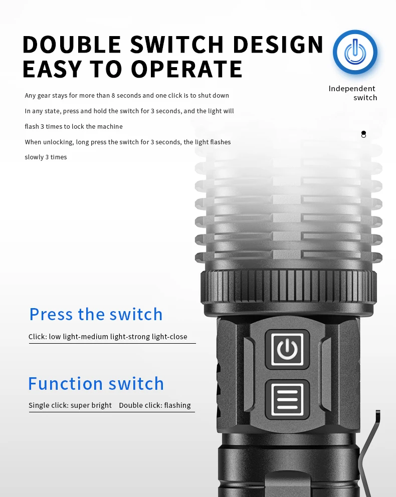 Светильник источник: XHP199Цвет внешнего вида: черный5-скоростной режим: 50%-75%-100%; Вспомогательный переключатель: Нажмите высокое светильник-нажмите дважды стробоскопРазмер: 170 мм × 45 мм × 33 ммМощность: 1x26650 аккумулятор (2600 мАч/5000 мАч)Время освещения: 6-12 часовМетод зарядки: Micro USB Прямая зарядкаДиапазон: от 500 до 800 метровЗум: зум-объектив (увеличение/уменьшение)Водонепроницаемость: IP65Вес: 260 г (без аккумулятора)Внешний аккумулятор: ПоддержкаИспользование: семья, охота, патрулирование, строительство, пробуждение, обслуживание, поиск и спасение