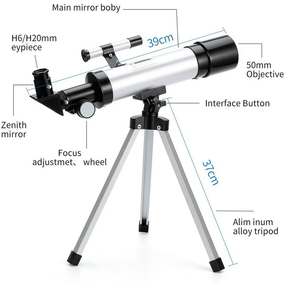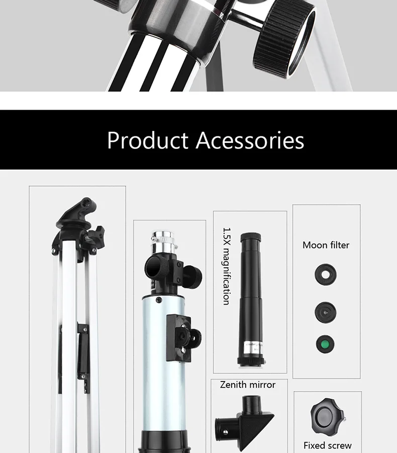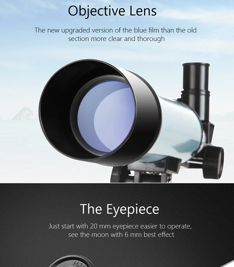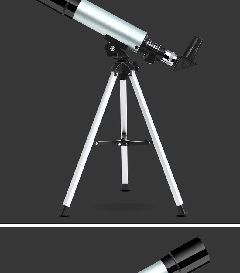Особенности:Рефракционный астрономический телескоп с диафрагмой 50 мм и фокусным расстоянием 360 мм, максимальная мощность 90x.Полностью стеклянная оптика с покрытием для повышения яркости и четкости изображения.1.5X установка окуляра для увеличения возможностей просмотра.Простая сборка без необходимых инструментов.Конструкция из алюминиевого сплава, легкая и портативная, хороший выбор для студентов или тех, кто хочет узнать больше о пространстве и природе.Характеристики:Материал: алюминиевый сплавДиафрагма: 50 ммФокусное расстояние: 360 ммМаксимальное увеличение: 90xОкуляр: H6 мм, h20 ммРазмер посылка: 39,7*21,7*8,7 см/15,6*8,5 * 3.4inПосылка Вес: 774g / 1.7lbПосылка:1 * Основная труба телескопа1 * Finderscope1 * h6 мм окуляр1 * H20 мм окуляр1*90 градусов зенитное зеркало1 * объектив с Луной1 * 1.5X монтажный окуляр1 * Штатив1 * Руководство пользователя (на английском языке)