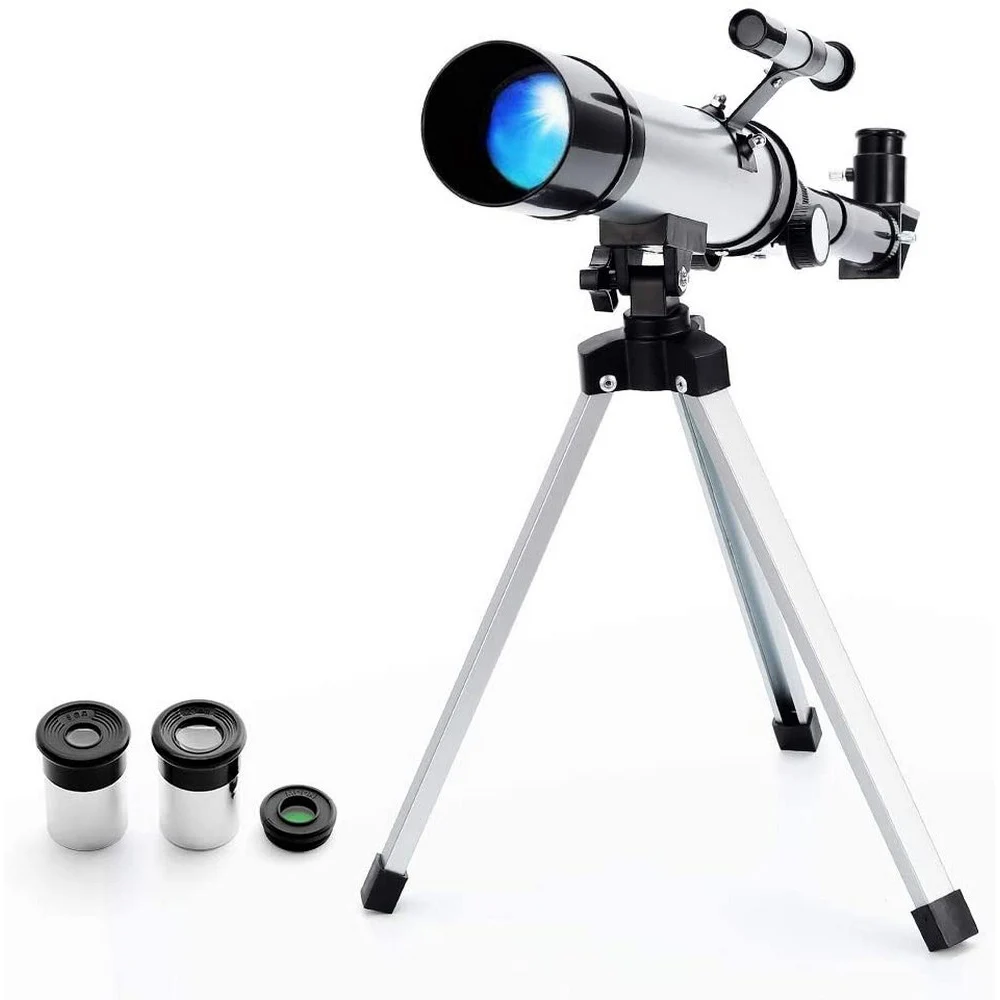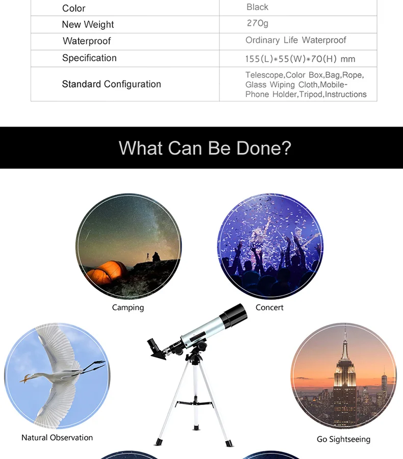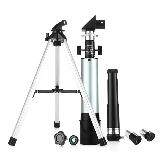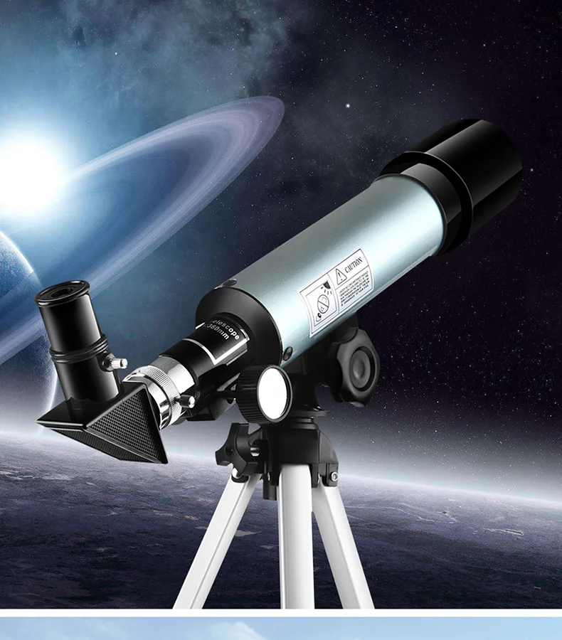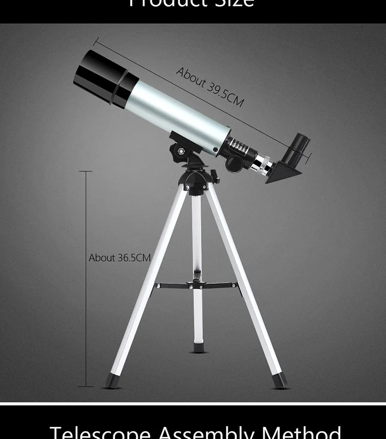 Особенности:Рефракционный астрономический телескоп с диафрагмой 50 мм и фокусным расстоянием 360 мм, максимальная мощность 90x.Полностью стеклянная оптика с покрытием для повышения яркости и четкости изображения.1.5X установка окуляра для увеличения возможностей просмотра.Простая сборка без необходимых инструментов.Конструкция из алюминиевого сплава, легкая и портативная, хороший выбор для студентов или тех, кто хочет узнать больше о пространстве и природе.Характеристики:Материал: алюминиевый сплавДиафрагма: 50 ммФокусное расстояние: 360 ммМаксимальное увеличение: 90xОкуляр: H6 мм, h20 ммРазмер посылка: 39,7*21,7*8,7 см/15,6*8,5 * 3.4inПосылка Вес: 774g / 1.7lbПосылка:1 * Основная труба телескопа1 * Finderscope1 * h6 мм окуляр1 * H20 мм окуляр1*90 градусов зенитное зеркало1 * объектив с Луной1 * 1.5X монтажный окуляр1 * Штатив1 * Руководство пользователя (на английском языке)