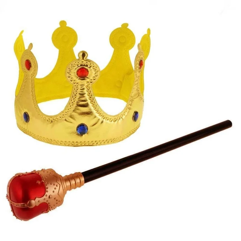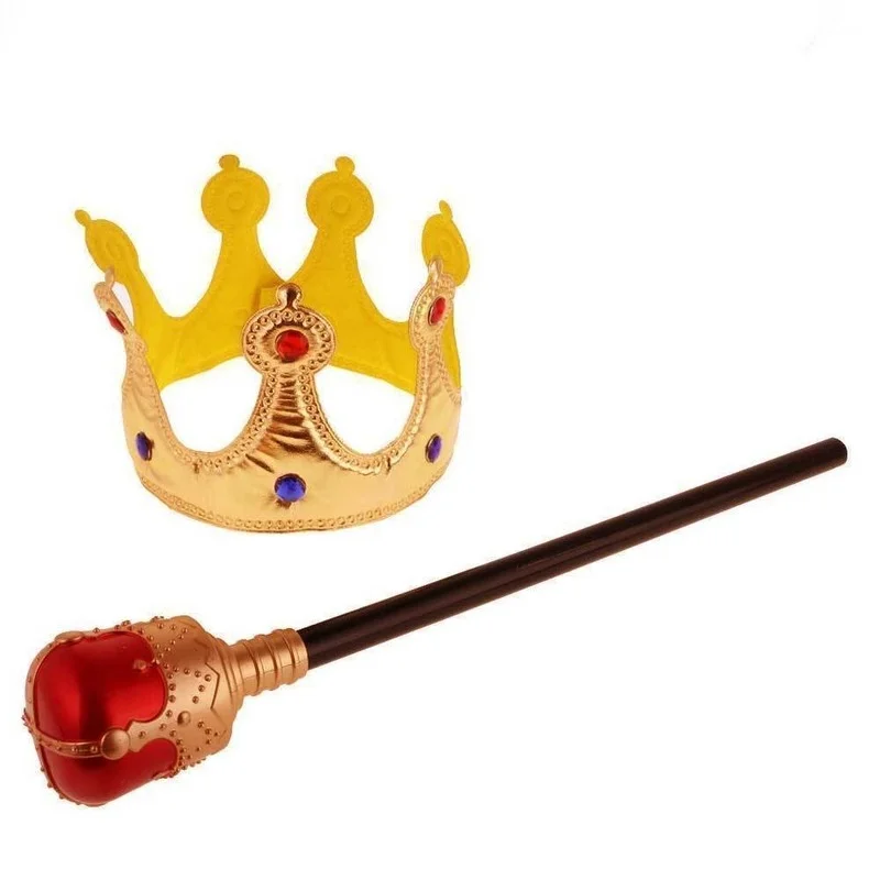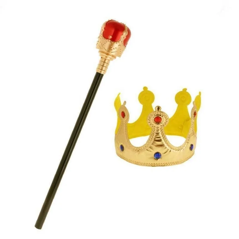 Этот королевский костюм включает в себя корону, украшенную великолепными и красочными драгоценностями и сверкающий скипетр.