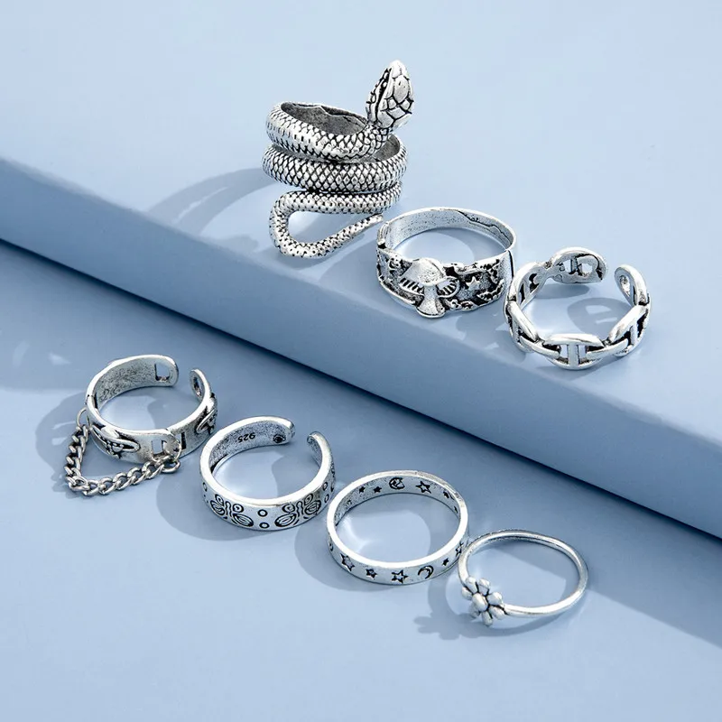 7 шт.компл. винтажные панковские кольца в виде змеи гриба бабочки для женщин и мужчин, модные геометрические кольца с цветком, ювелирные изделия, аксессуары