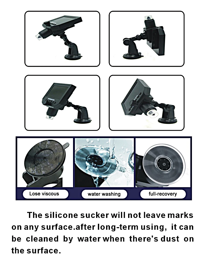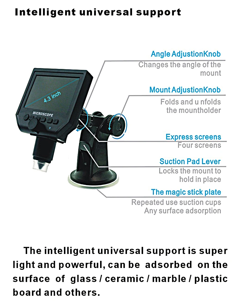 Обратите внимание, что у 600X есть три разных основания кронштейна, пожалуйста, обратите вниманиеМеталлический кронштейнОснование присоскиОпора под локотьОсновные параметры:1: пиксель: HD МП CCD2: Дисплей: 4,3 дюймовый HD ЖК-дисплей.4: Увеличение: система непрерывного увеличения 1-600X.5: расстояние до объекта: 15 мм-бесконечность6: со встроенной литиевой батареей, непрерывная работа в течение 6 часов.7: Языки: английский, испанский, русский, корейский, японский, тайский, иврит, португальский, немецкий, французский, Италия, Турция, чешский, Польша, традиционный китайский, упрощенный китайский.Для полной зарядки литиевой батареи большой емкости требуется около 4 часов.