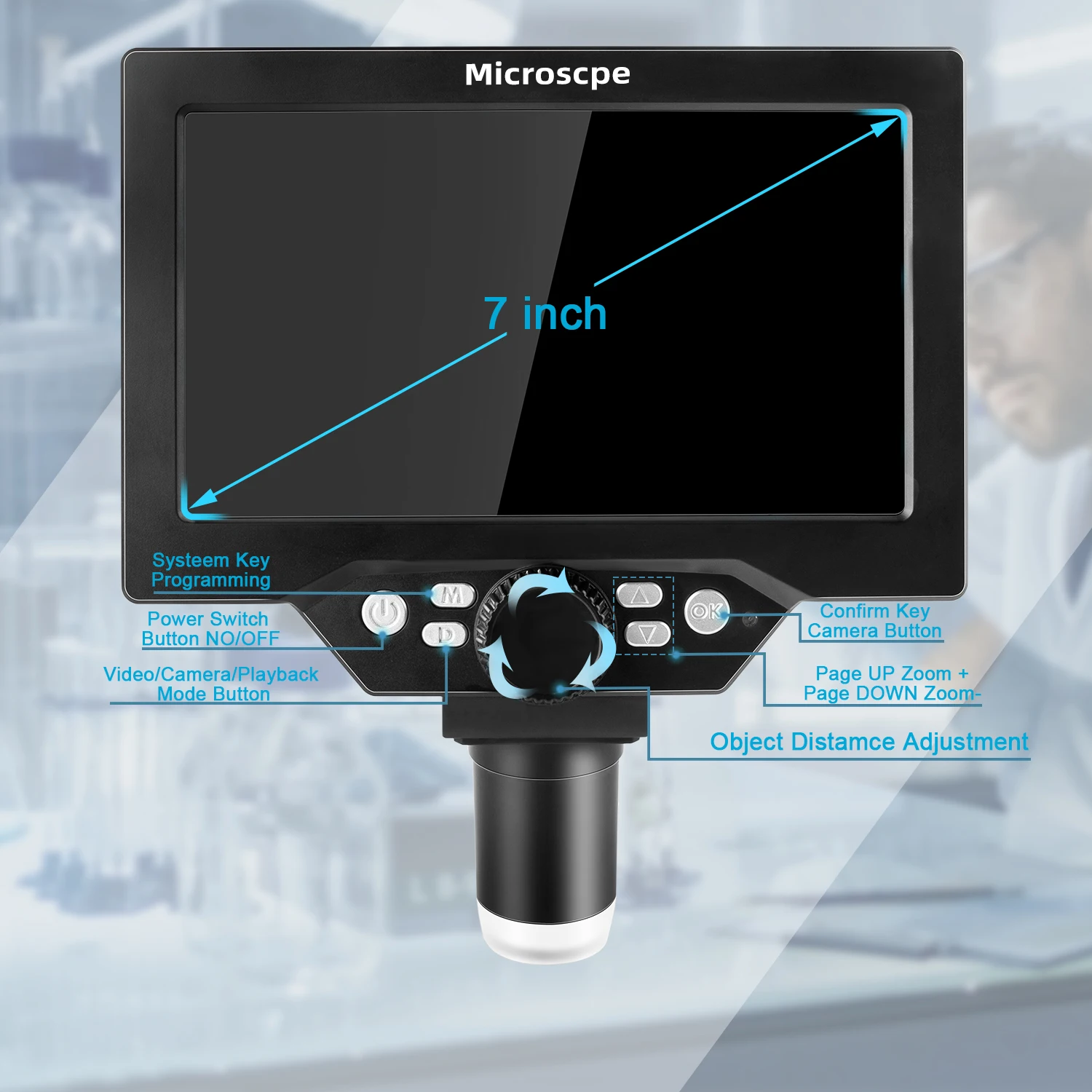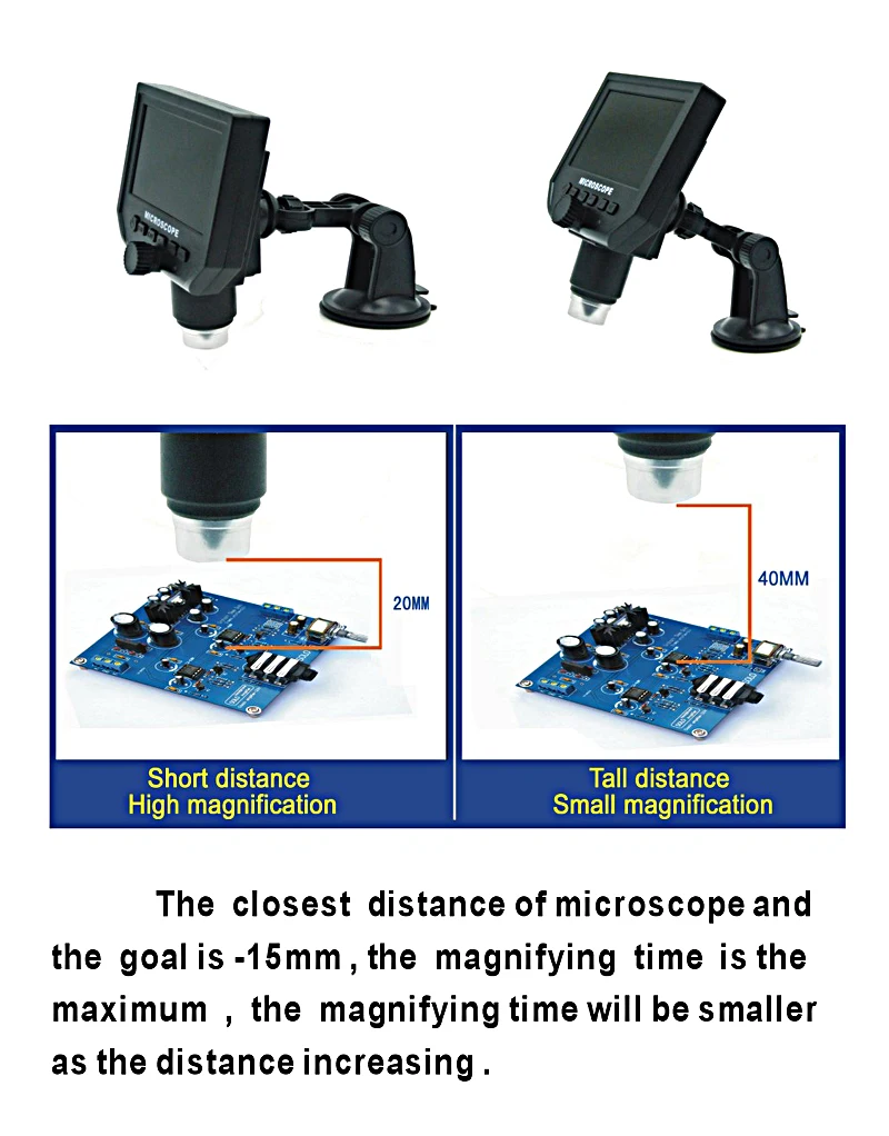 Основные параметры:1: пиксель: HD 12 МП2: Экран дисплея: 7-дюймовый HD ЖК-дисплей.3: увеличение: 1-1200 × система непрерывного усиления.4: расстояние между объектом: от 10 мм до бесконечности (различные расстояния соответствуют разным кратным)5: съемная или Встроенная ультралитиевая батарея.6: шестнадцать языковых систем: английский, испанский, русский, корейский, японский, тайский, иврит, Португалия, немецкий, французский, Италия, Турция, чешский, Польша, традиционный китайский, упрощенный китайский.Значительные улучшения:Преимущество 1:Вертикальные микроскопы имеют важный недостаток, потому что они используются во многих приложениях, таких как припой на печатных платах, обозначение модели некоторых крошечных чипов и металлов, из-за отражения легко потерять детали объектов. Наш продукт специально решает эту проблему. Это регулируемый под углом цифровой микроскоп, который решает проблему высокого отражения. Это большой опыт работы в отрасли обслуживания электроники, и это важно отметить. Эта машина имеет больший диапазон, чем другие, потому что она имеет определенное количество места для работы. Очень удобно использовать пинцет, Электрический паяльник и другие предметы под микроскопомПреимущество 2:Большинство других микроскопов имеют двухступенчатое увеличение, либо слишком большое, либо слишком маленькое. Всегда будет визуальное сожаление.Это цифровой микроскоп с непрерывным увеличением и зумом, и он имеет широкий спектр опций просмотра по сравнению с другими микроскопами, в диапазоне от 1 до 1200 кратного увеличения, И всегда найдите подходящее множество для вас.Ближайшее расстояние между линзой машины и объектом составляет около 10 мм, при максимальном увеличении. Напротив, чем дальше линза находится от объекта, тем меньше увеличение.