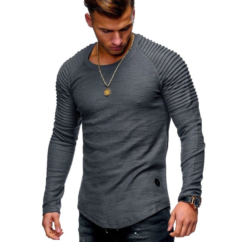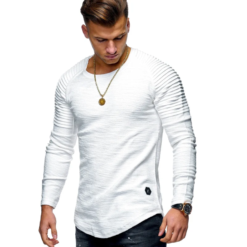 Однотонная плиссированная футболка с длинным рукавом, Мужская Весен...