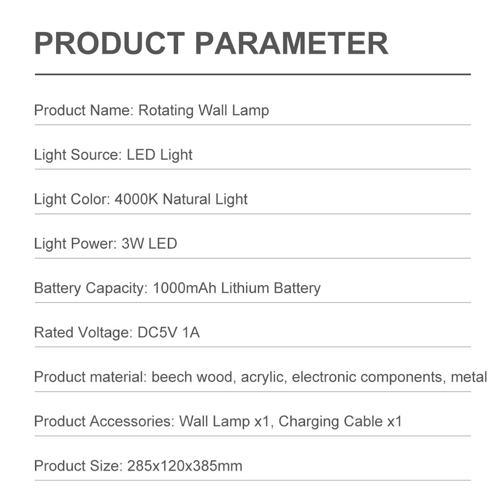 Светильник источник света: светодиодный светильникСветильник Цвет: 4000K белый светильникСветильник Мощность: 3 Вт светодиодный Емкость батареи: 1000 мАч литиевая батареяНоминальное напряжение: DC5V 1AМатериал изделия: бук, акрил, электронные компонентыIP Рейтинг: IP20Стандартная конфигурация продукта: настольная лампа × 1, кабель для зарядки × 1
