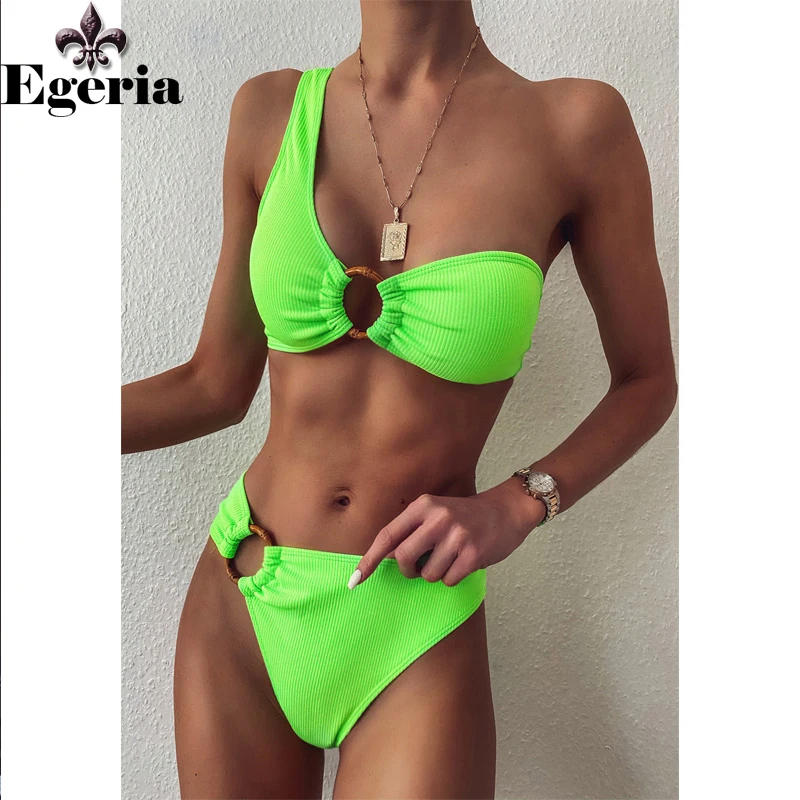 Женский купальник на одно плечо, купальник с высокой талией, сексуальные кольца, бикини, черная ребристая пляжная одежда, бразильские бикини 2021