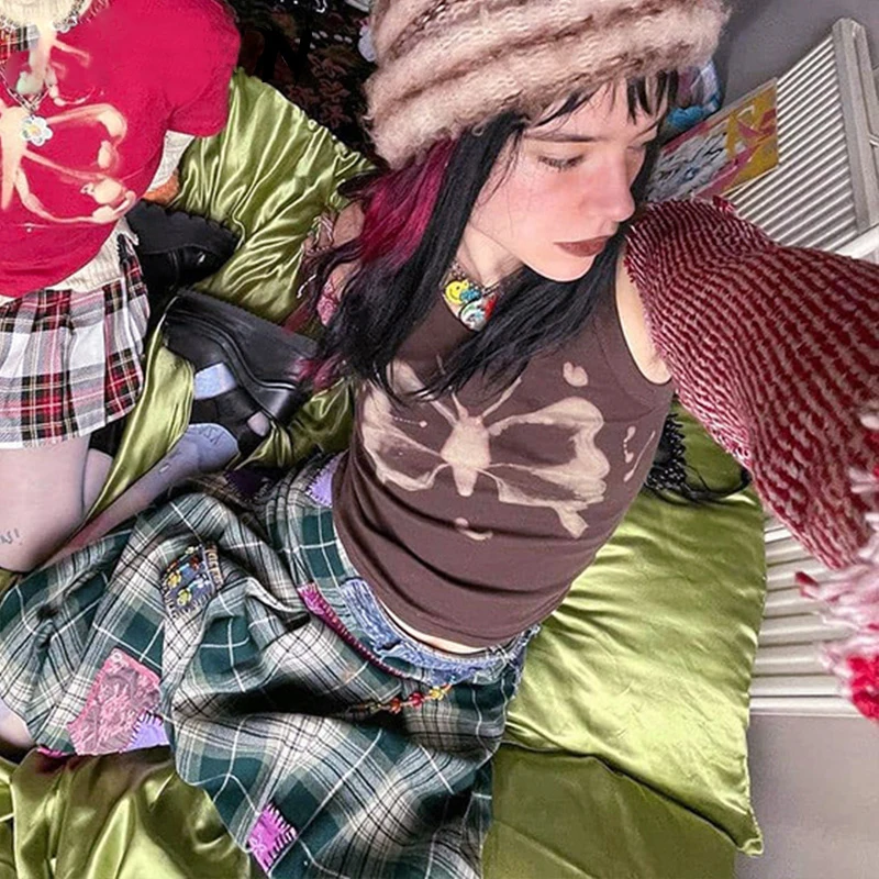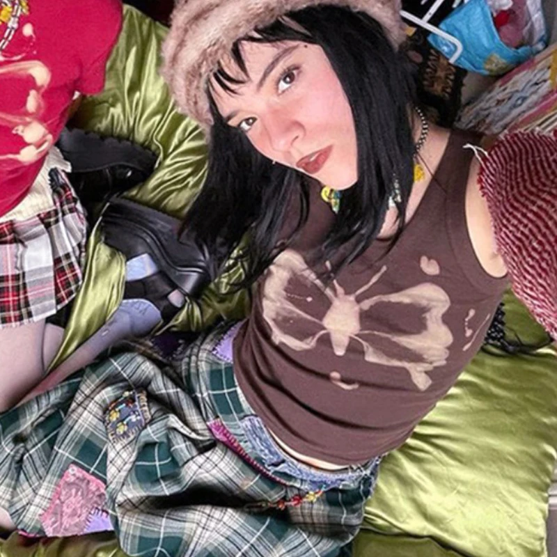 Y2K с винтажным принтом из бабочек, коричневый Топы Инди в уличном ...