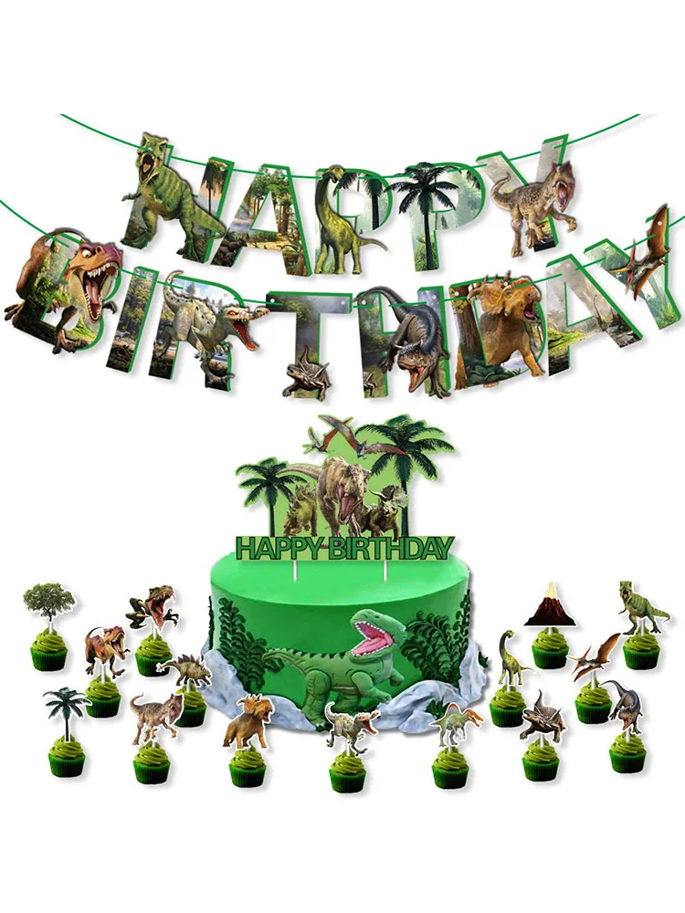 Украшение в виде динозавра, яркий флаг, Набор открыток для торта, детский баннер на день рождения, декоративные принадлежности