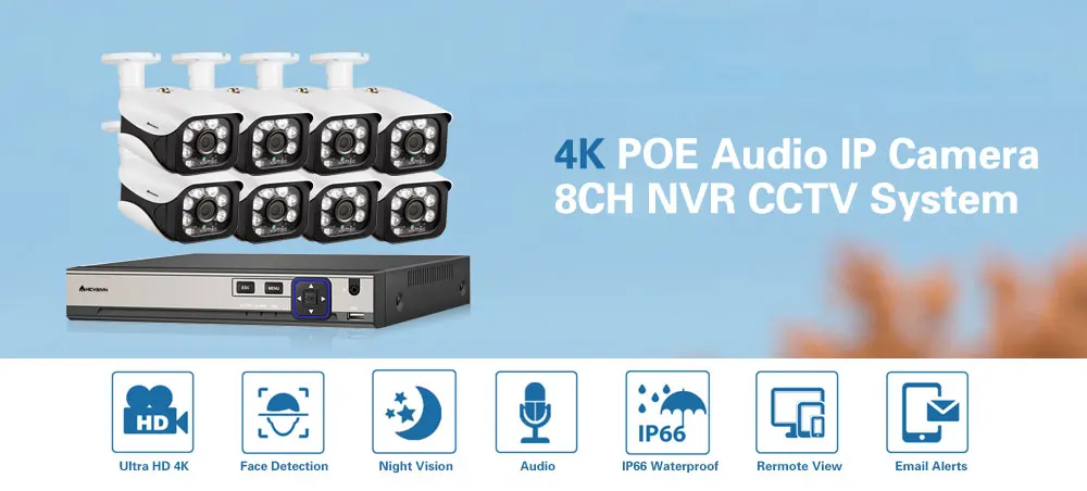 1. Все наши NVR и камеры являются реальными H.265 4K 8MP, NVR может поддерживать 8MP и 4K max, вы можете подключить 720p,1080p,3mp,4mp ,5mp, камеры 8mp & 4k с нашим POE NVR;2. Наш NVR и камеры поддерживают расширенное H.265 Сжатие видео, питание через Ethernet, подключи и работай, прост в использовании;3. Все камеры встроены в микрофон, поддерживают аудиозапись, поддерживают режим ночного видения Ultra HD;4. Все камеры имеют металлический материал, IP66 водонепроницаемый, подходит для внутреннего и наружного использования, надежная Домашняя безопасность;5. Поддержка обнаружения движения, оповещения по электронной почте, воспроизведение видео, многоязычный;6. Поддержка Android,Iphone,Ipad,PC,VMS,P2P view;7. Удаленный доступ в любом месте, в любое время;8. Подходит для всех видов мест применения;