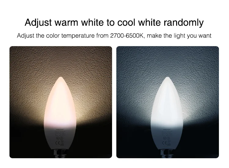 Название продукта:4 Вт RGB + CCT Свеча светильникНомер модели:FUT108Мощность: 4 ВтНапряжение: AC100 ~ 240V 50/60HzРабочая температура. : -10 ~ 40 °CЦветовая температура. : 2700K ~ 6500KСветовой поток: 300 лмСветоотдача: 75 лм/ВтCRI: >80PF: 0,55Срок службы: 50000 чУгол луча: 180 °RF: 2,4 ГГцРасстояние управления: 30 м