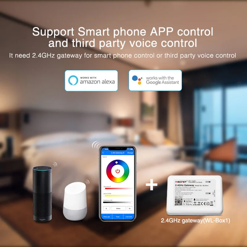 Он нуждается в 2,4 ГГц шлюз (WL-Box1) для управления смартфоном или третьей вечерние Голосовое управление