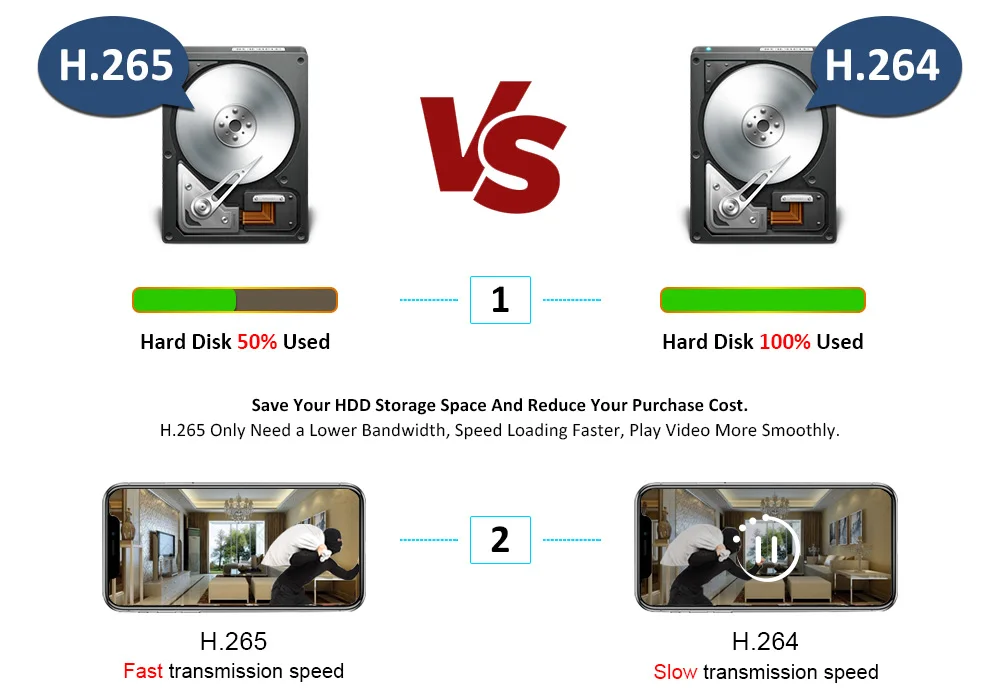 H.265 более четкий, HD разрешение предлагает вам лучшее качество изображения в более низкой скорости. Экономьте больше места для хранения, вы можете уменьшить размер файлов 40%-50%, сэкономить место для хранения HDD и снизить стоимость покупки.