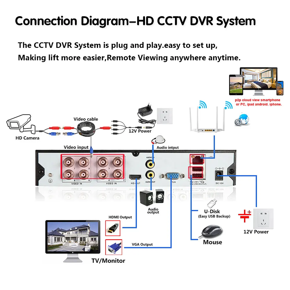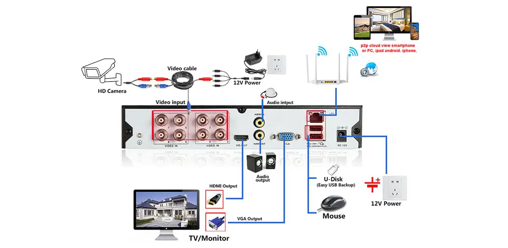 Простая настройка, всего 4 шага для просмотра мобильный телефон, просмотра видео в режиме реального времени из любого места и в любое время с помощью смартфона, стола или ПК с передовой технологией P2P, вы можете получить удаленный доступ к вашей системе за считанные минуты или меньше, нет необходимости в переадресации, удаленный доступ никогда не был таким простым!