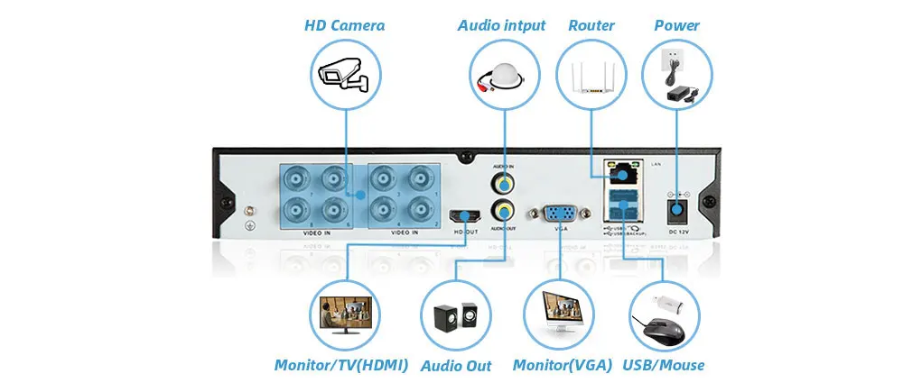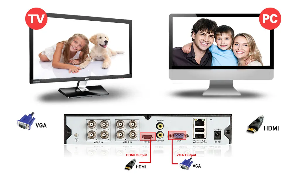 Просмотр на мониторе HDMl легко отображает видео через порт HDMI вашего монитора компьютера, чтобы в полной мере воспользоваться ясностью системы безопасности. (кабель HD не входит в комплект)Просмотр на телевизоре или мониторе ПК для дополнительного удобства, видеорегистратор также поставляется с подключениями VGA и BNC для стандартных вариантов просмотра разрешения.(Кабель VGA или BNC к RCA не входит в комплект.)
