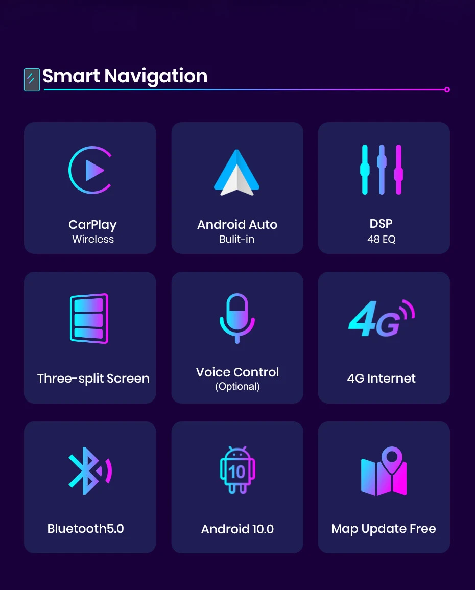 Встроенный беспроводной Carplay и Android авто функция, для беспроводной Carplay, вам просто нужно подключить к телефону с bluetooth; И для Android Auto, вам нужно только использовать usb-кабель для соединения телефона и радио, управления и управления мобильными телефонами через устройство, откройте безопасную жизнь вождения.