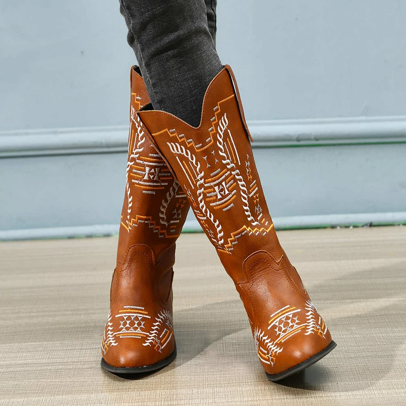 Новые женские ботинки, осенне-зимние кожаные ботинки до середины икры, женские модные ботинки с вышивкой и острым носком на толстом каблуке для женщин