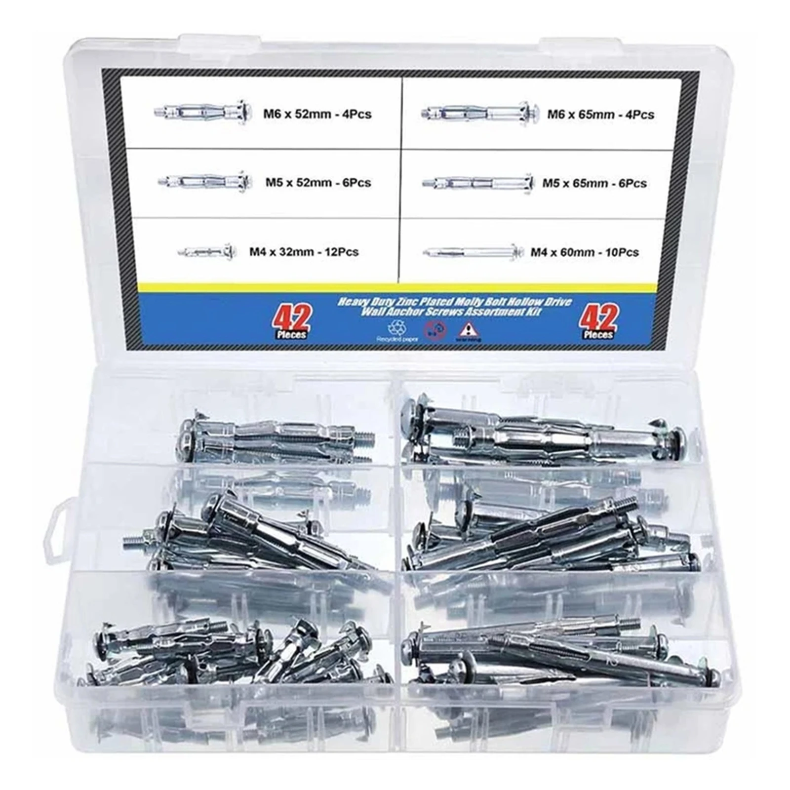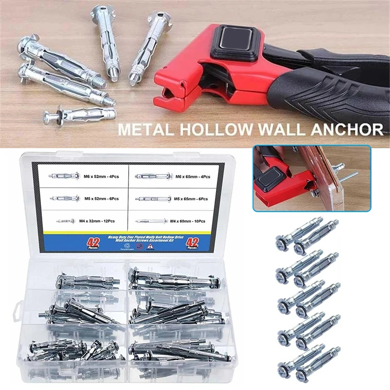Набор тяжелых Расширительных болтов, 42 шт., оцинкованные полые приводные настенные анкерные винты, набор для болтов штукатурка гипсокартон и плитки M4 M5 M6