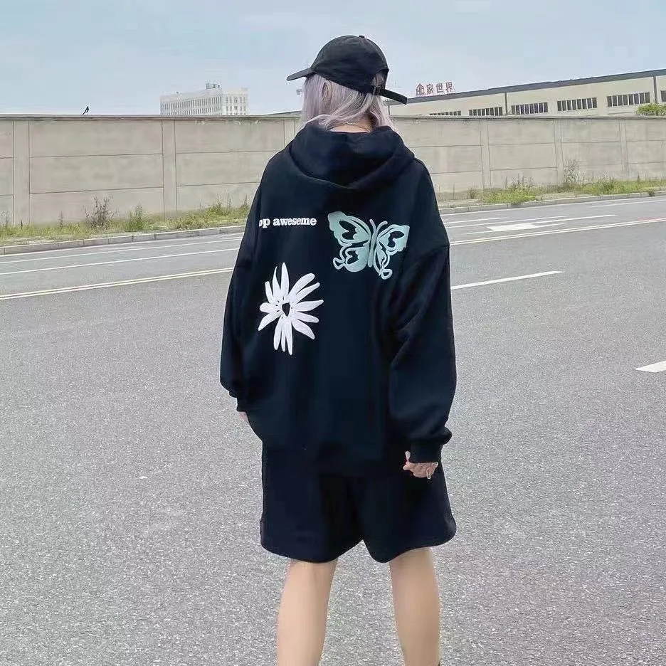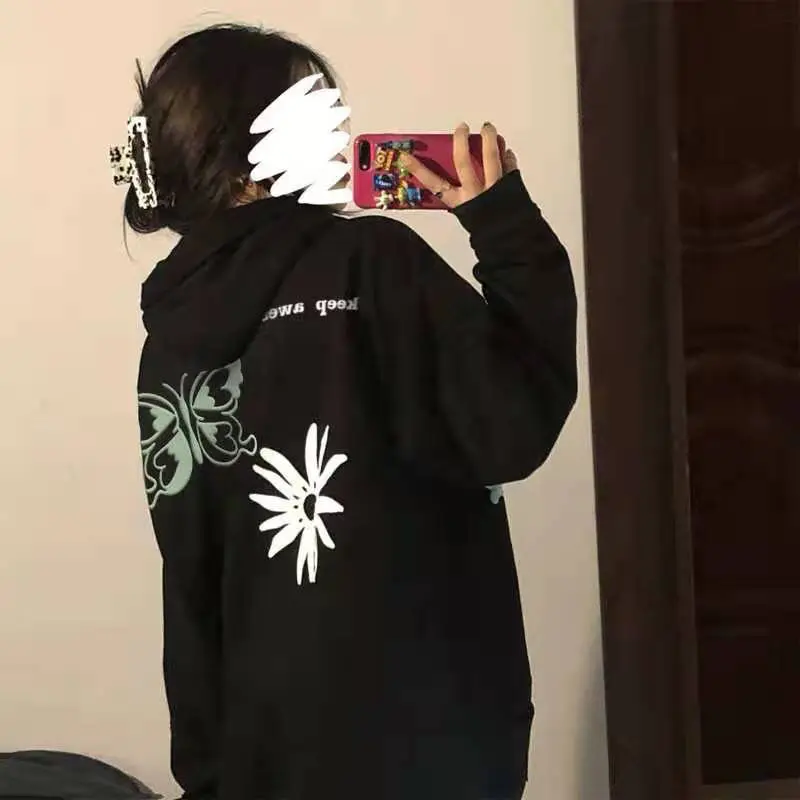 Женская винтажная толстовка с капюшоном, черная куртка в американском стиле с длинными рукавами и принтом бабочек, большие размеры, Y2K