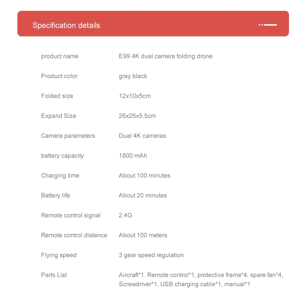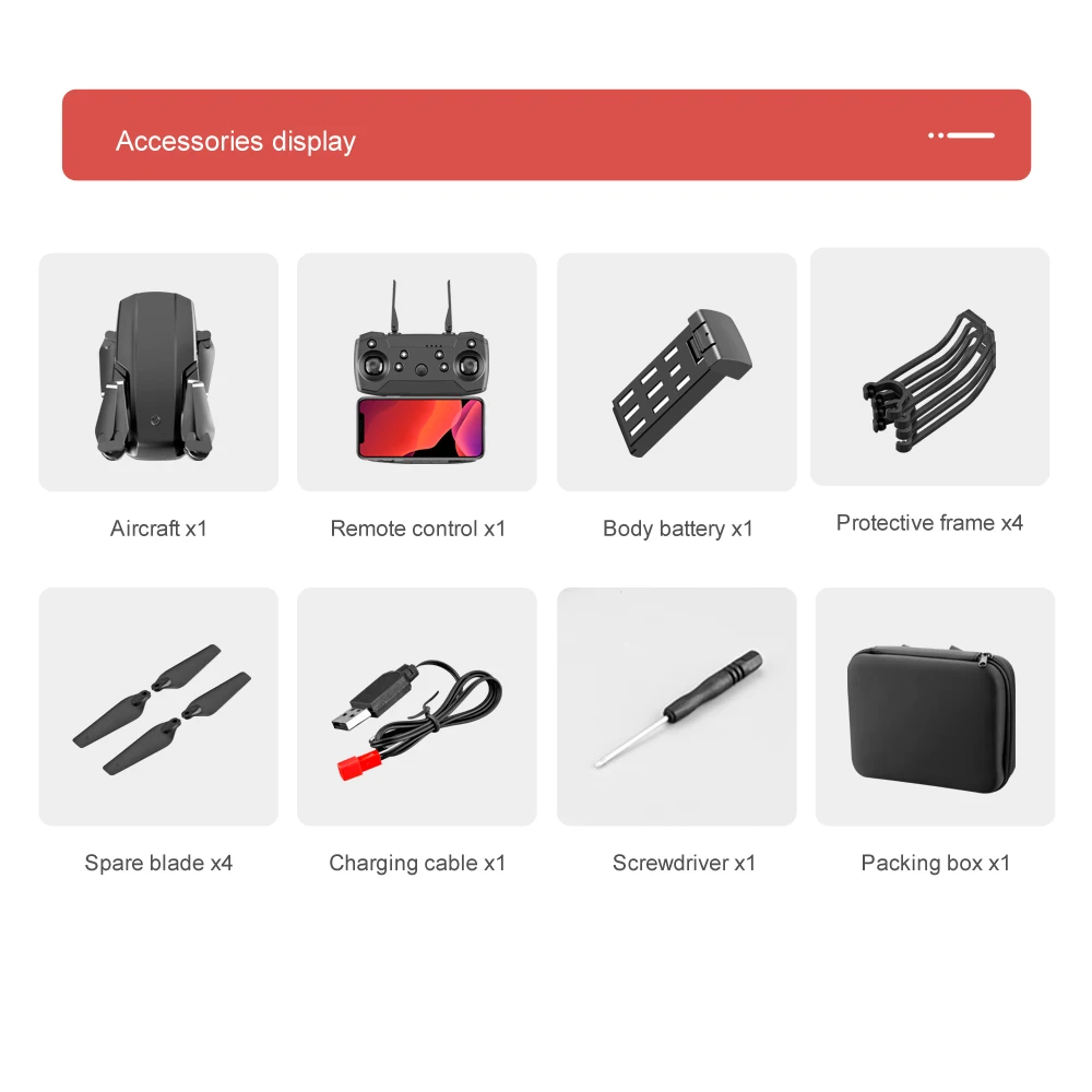 Функция: вверх/вниз, вперед/назад, поворот влево/вправо, босветильник, 3-уровневая световая скорость, светильник, Безголовый режим, автоматический возврат одной кнопкой, режим удержания высоты, Wi-Fi FPV, траектория светильник, камера/видео