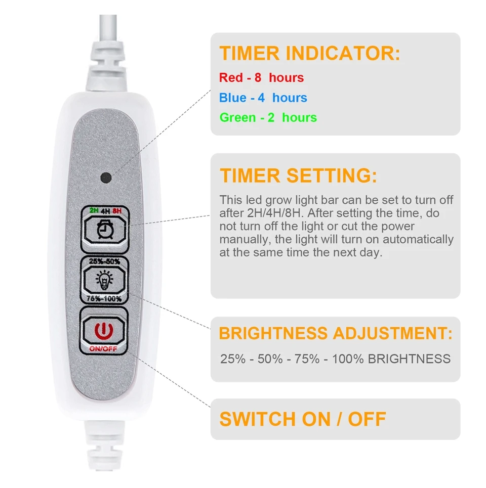 4 шт. светодиодный светильник для выращивания растений, USB таймер, фитолампа для растений, светодиодный светильник с регулируемой яркостью, фитоусилители, полный спектр, гидропоника, растущие лампы[Полный спектр растительный светильник]Этот растущий светильник излучает все длины волны светильник от 380нм до 780нм, как естественный солнечный светильник. Под этот светильник, рост растений может быть ускорен.[2H/ 4H/ 8H Таймер Автоматическое включение и выключение каждый день]Этот светодиодный светильник для выращивания может быть установлен для выключения после 2H/4H/8H. При использовании автоматического включения и выключения, не выключайте светильник или не отключайте питание вручную, лампа включится автоматически в то же время на следующий день.[Четыре уровня для регулировки яркости]Нет worring о сжигании растений даже установка 100%.25%, 50%, 75%, 100% прочности. Каждая яркость может обеспечить светильник полного спектра.Три полосы 10 Вт и 72 светодиодный светильник достаточно излучают, чтобы покрыть все этапы роста растений.[Eaasy Установка]-Светильник для выращивания бар поставляется с винтами и приклеивается к задней панели, так что он может быть легко установлен.Шнур питания длиной 94,47 дюйма для легкой установки в офисах, в помещении, на стойках растений, теплицах и так далее.Особенности:Высокая эффективность и энергосбережениеБезопасность и здоровье для ваших растенийШирокий диапазон покрытия для ваших растений, которые обеспечивают достаточный светильник для роста. Сделайте ваши растения растут быстрее и здоровее.Максимальная температура: 140 ℉. (Безвреден для ваших растений)Максимальное расстояние между двумя лампами-светильник: 33 дюймаПодходит для орхидей, суккулентов, цветов, семян, базилика, розмарина, нарциссов, плюмерии, алоэ, тимьяна, огурцов, помидоров, перцев и т. д.Спецификация:Sunlike светодиодный светильник для выращивания: 10 Вт/барМатериал: ПВХЭквивалентная Мощность: 40 Вт/30 Вт/20 ВтВходное напряжение: 12 В/12 В/5 ВСветодиодный Кол-во чипов: 48 Светодиодный чипы для каждого бараДлина волны: 380-780 нм светильникСрок службы: >50000 часовСветильник бар: 13,2 дюйм (ов)Шнур питания: 43,3 дюйма/43,3 дюйма/71 дюймаМногократное использование:Светодиодный растительный светильник используется для теплицы, фермы, садоводства, комнатной гидропоники или аквафонной посадки и садоводства.Посылка включает в себя:1 растительный светильник (4 полоски/3 полоски/2 полоски)1x адаптер питания1x Двусторонняя лента16 винтов/12 винтов/8 винтов1x Руководство пользователя