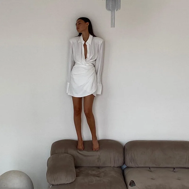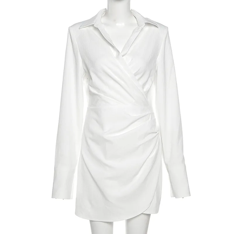 Женское облегающее мини-платье Fanslan, повседневное однотонное белое платье-рубашка с длинным рукавом и глубоким V-образным вырезом для вечеринки на лето и осень