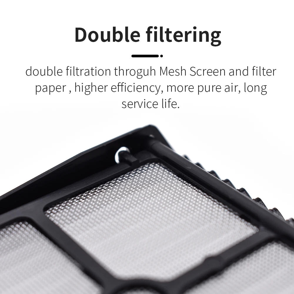 1), плотно прилегает к краям корпуса, не оставляя пыли.2) изготовлен из высококачественного АБС-материала, долговечный и длительный срок службы.3), используя предварительный фильтрующий материал, который эффективно фильтрует золу и сливает чистый воздух.4) фильтрация 99 процентов грязи, пыли, волос домашних животных и мелких мусора.