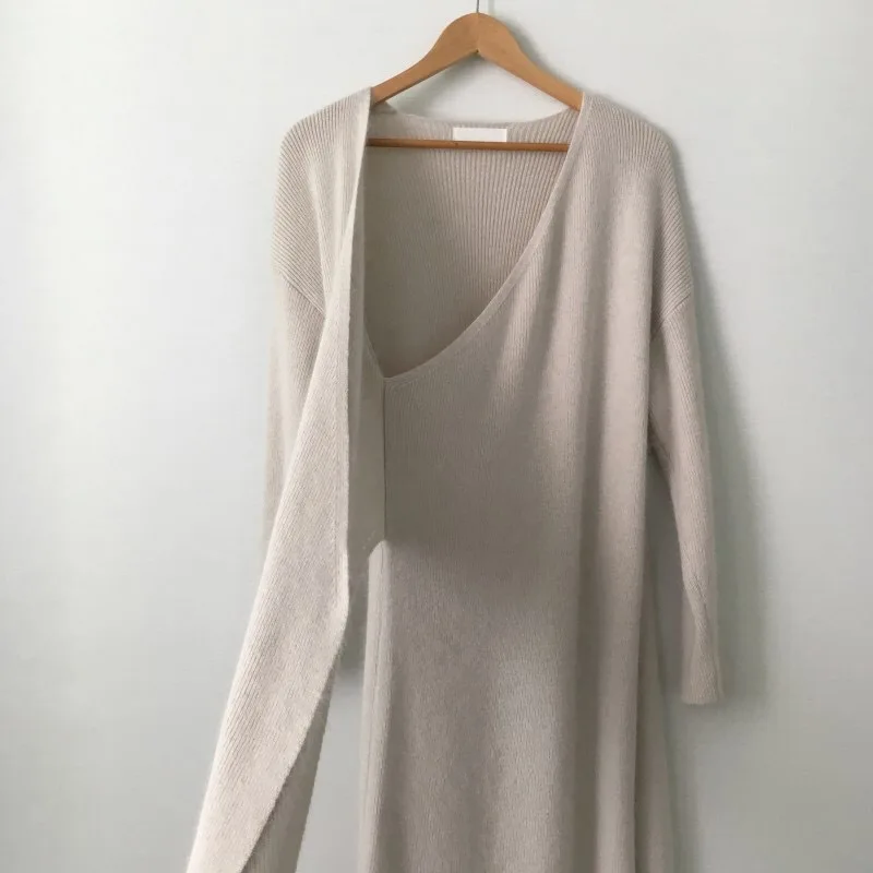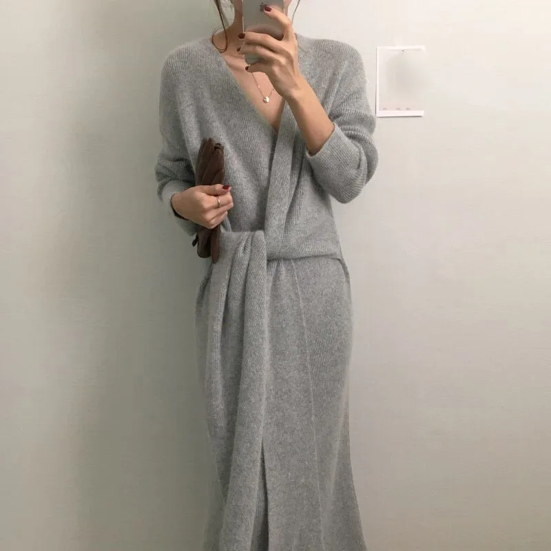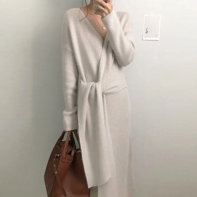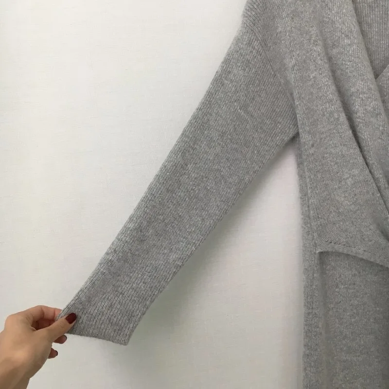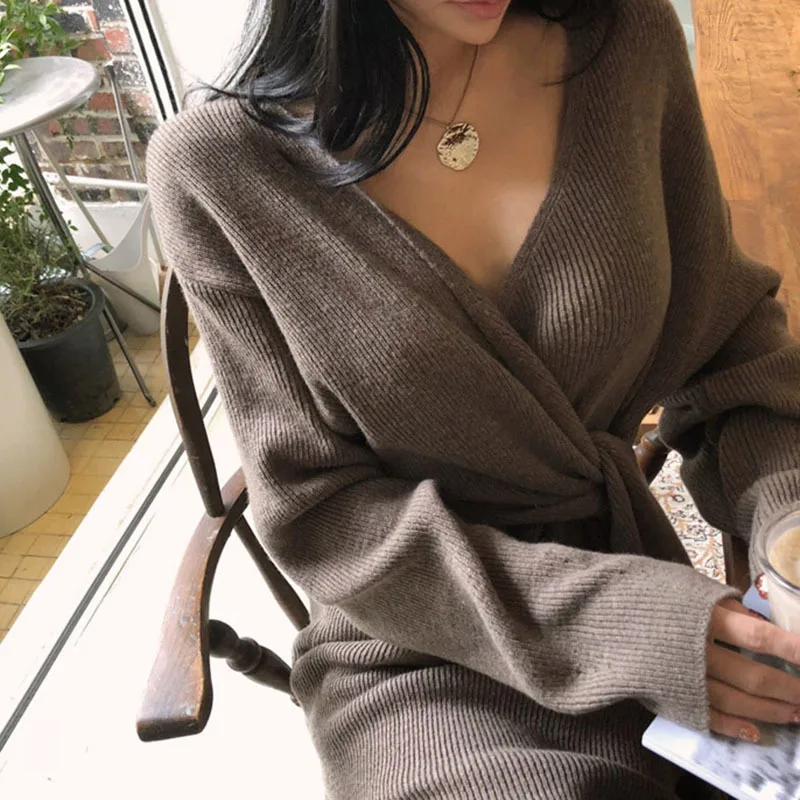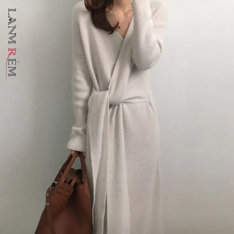 LANMREM 2022 весеннее Новое корейское трикотажное платье с длинными рукавами, v-образным вырезом и перекрестным галстуком, женское повседневное модное женское платье 2W329