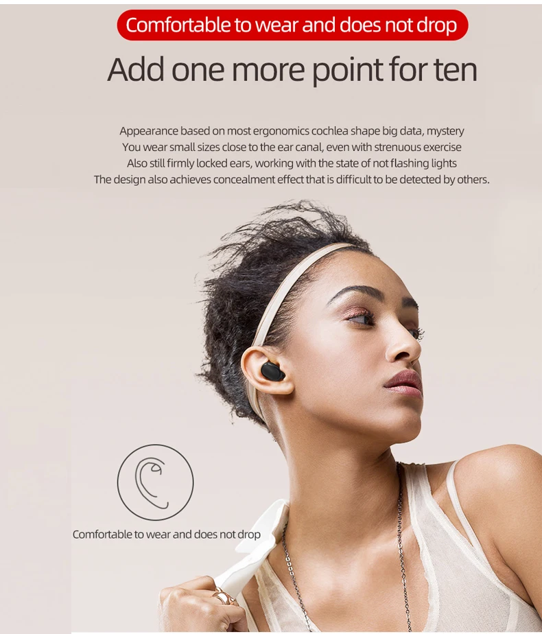 Управление одной кнопкой легко включить/выключить, воспроизведение/пауза/Переключение музыкиЗвонки без рук для вождения, работы, встречи, бега.Одно-два подключения, можно подключить к двум мобильным телефонам одновременно.Интеллектуальная Совместимость: Поддержка всех Bluetooth мобильный телефон, планшет, ноутбук, QQ музыка, фильмы и т. Д., универсальный мобильный телефон.Характеристики:1. Версия Bluetooth: V5.02. Расстояние Bluetooth: 10 м3. Время зарядки: около 1-2 часов4. Время работы в режиме ожидания: около 80 часов5. Время работы в режиме воспроизведения музыки: около 2,5 часов6. Время разговора: около 3 часов7. Аккумулятор для наушников: полимерный литиевый аккумулятор 45 мАч8. Аккумулятор: полимерный литиевый аккумулятор 280 мАч9. Формат передачи аудио: HFP/A2DP/HSP/AVRCPПосылка включает в себя:Наушники TWS Bluetooth (левый и правый уши)-1 шт.1 x Зарядное устройство 280 мАч1 х USB кабель для зарядки1 x Руководство пользователя4 x Ушная крышка