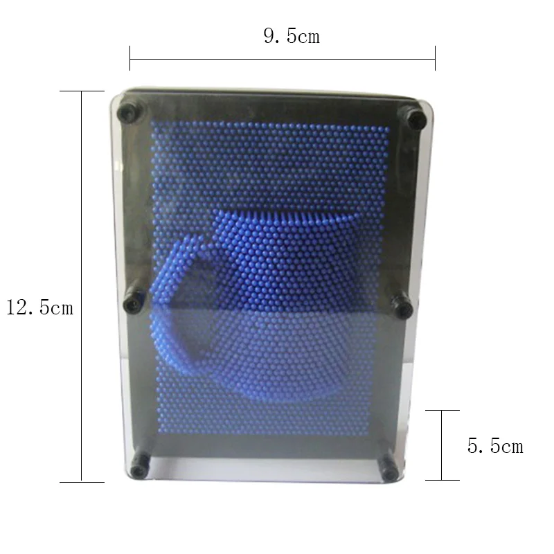 Просто нажав на предмет (или Причастие) в множество тупых штифтов, вы создадите 3d-скульптуру со всеми тонкостями контуров, точно запечатанными. Впечатление остается нетронутым до тех пор, пока устройство не нарушено. Завораживающий, художественный и веселый!