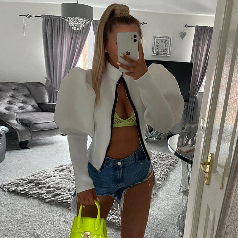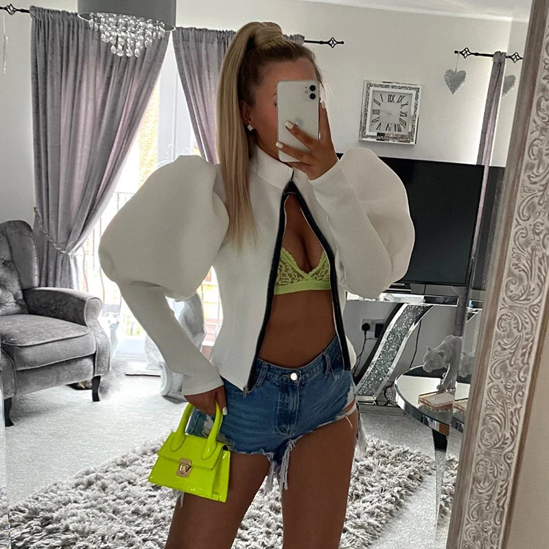Женская короткая куртка Adogirl с пышными рукавами, в стиле Харадзюку, с высоким воротником, на молнии, приталенное пальто, осенняя Повседневная Верхняя одежда, 2021