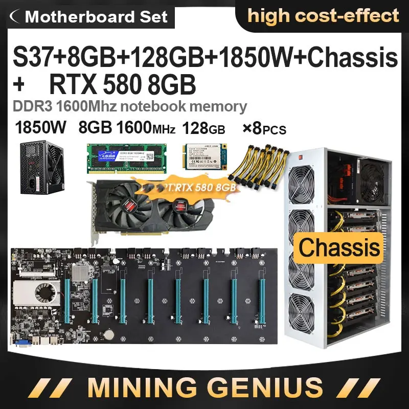 Материнская плата для майнинга BTC S37, 8 ГБ DDR3, 1600 МГц ОЗУ, мощность 1850 Вт, MSATA чехол для майнинга, 4 шт. RX 128