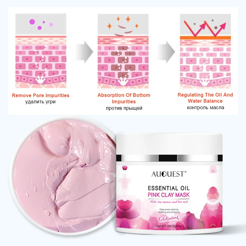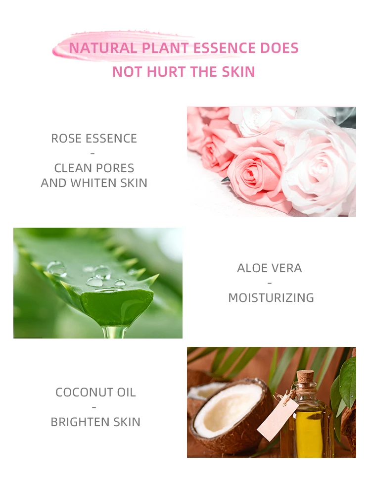 Этот продукт содержит специально добавленные эфирные розы, которые могут не только успокоить и успокоить кожу лица, но и отбелить и увлажнить. Розовая глина каолин в этом продукте-своего рода мягкий минерал с сильной адсорбцией, который может глубоко очистить поры и удалить черные точки. Кроме того, это не вызовет прорыва акне. Отшелушивание, контролируя секрецию масла, возвращает гладкость кожи лица.