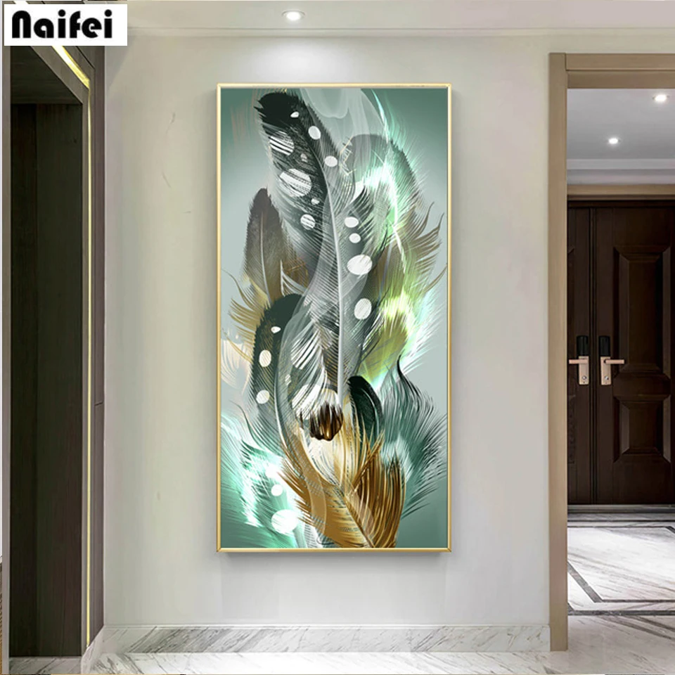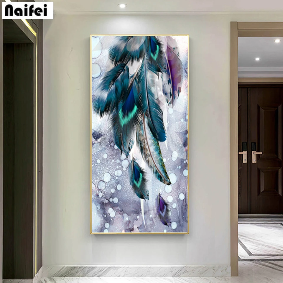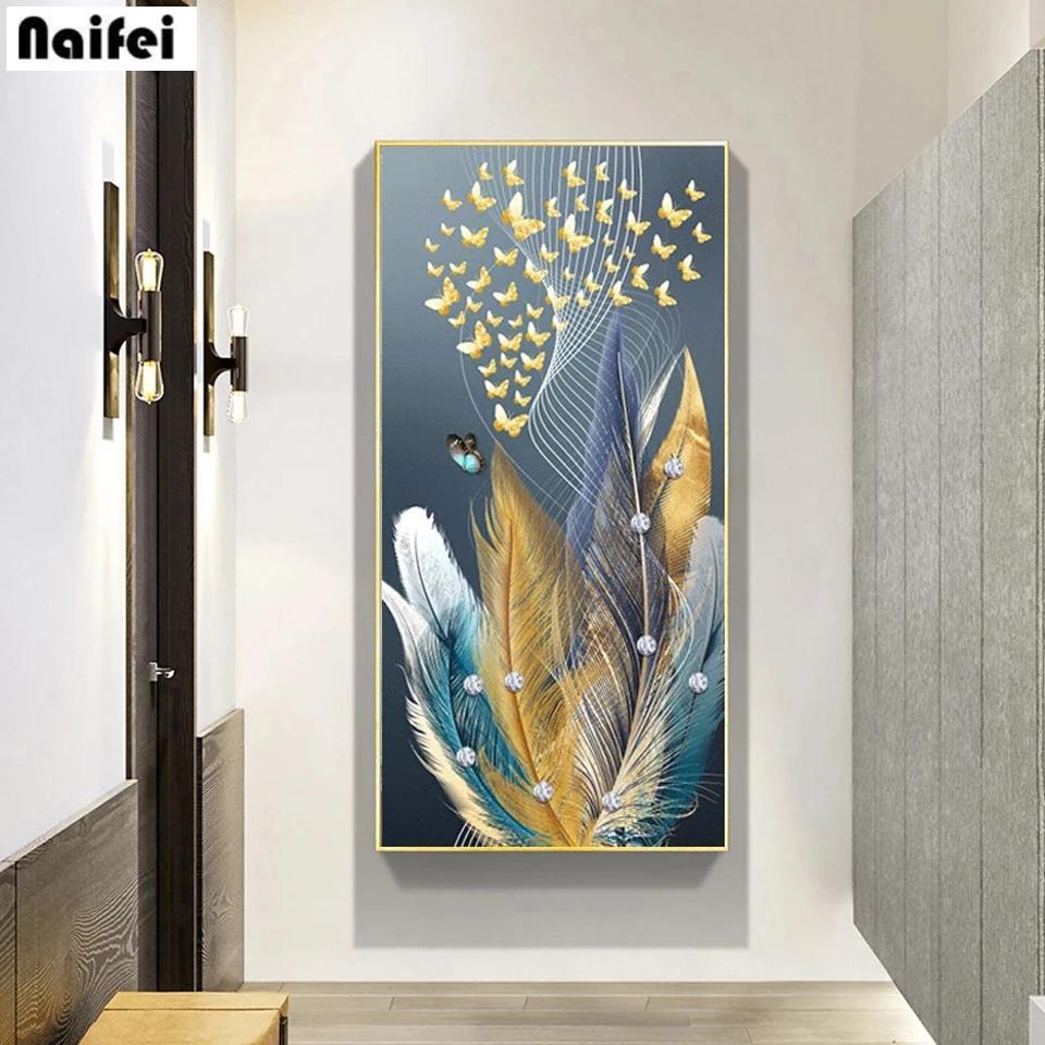 Алмазная живопись 5d сделай сам, современная абстрактная мозаика с голубыми золотыми перьями, бабочками, полное заполнение, Набор для вышивки крестиком, домашний декор