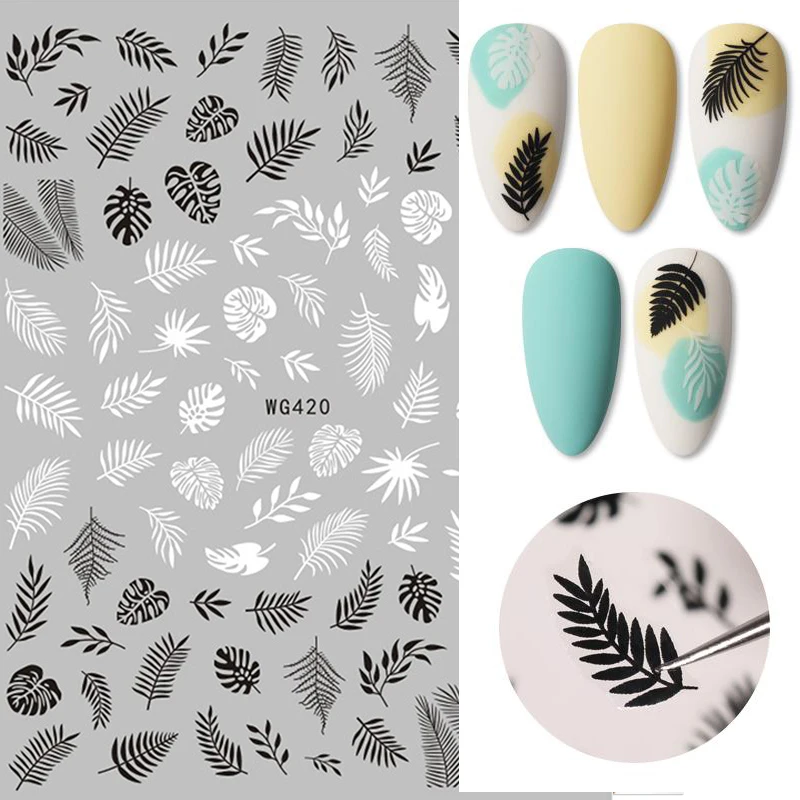 Черно-белый крутой геометрический узор водные наклейки Цветочные листья слайдер для ногтей Летние Осенние украшения для ногтей сделай сам