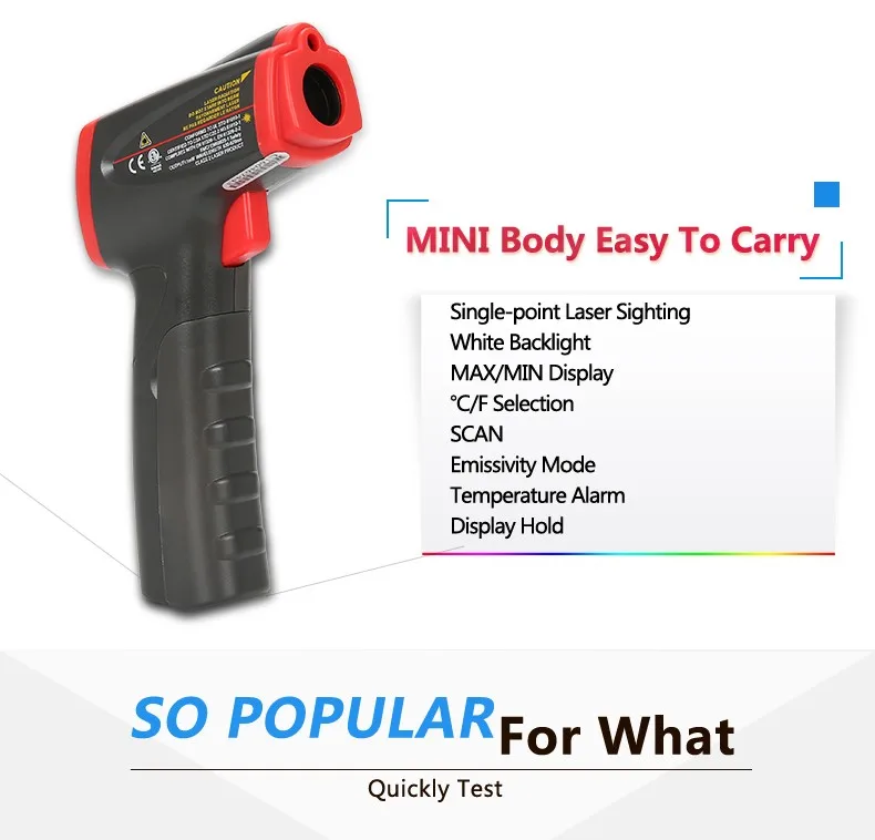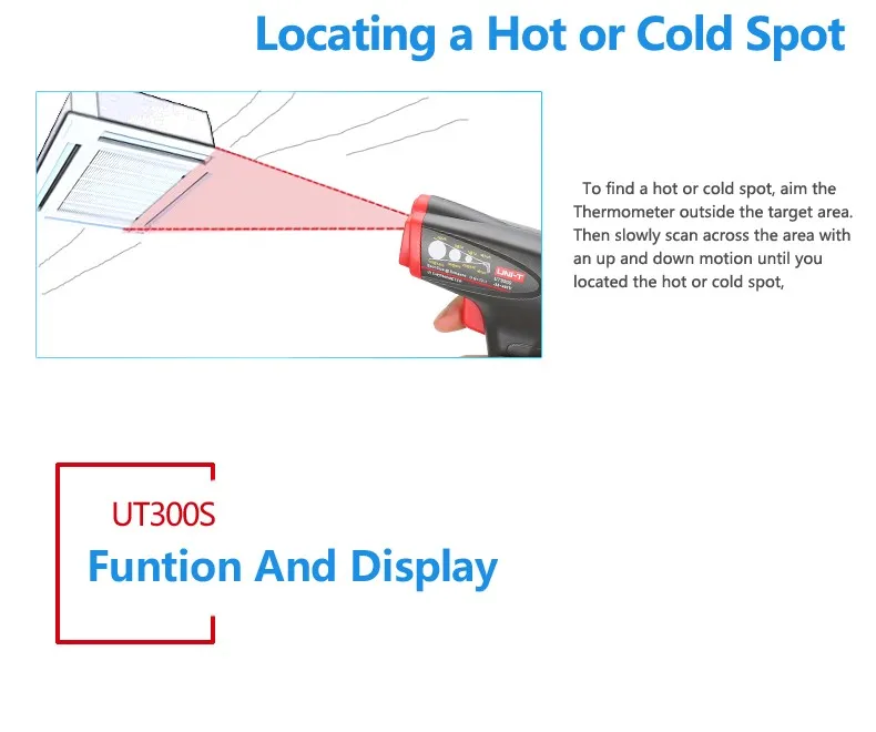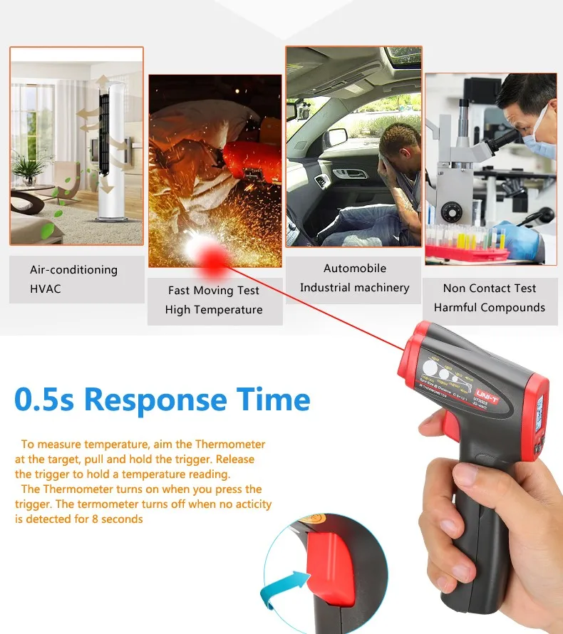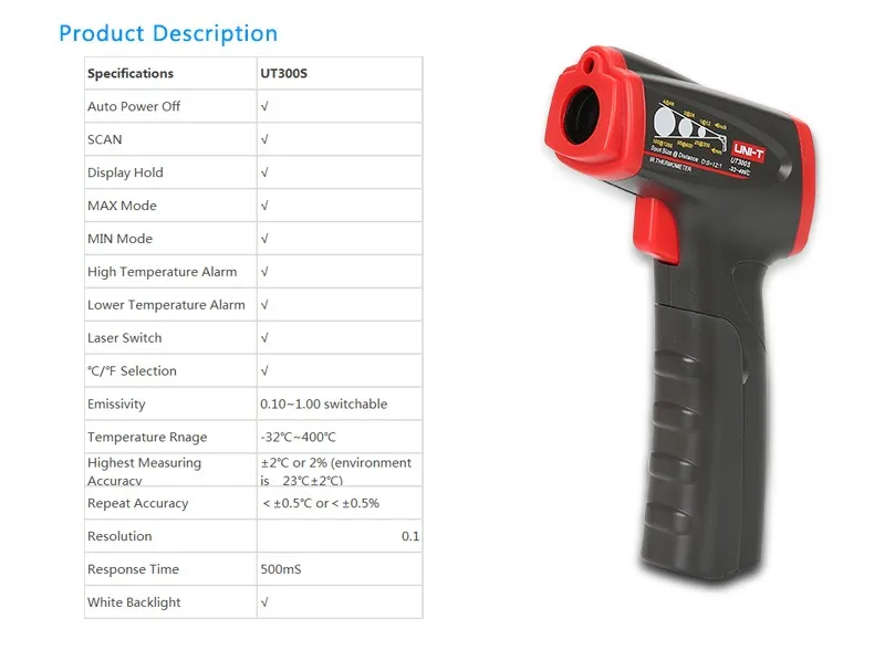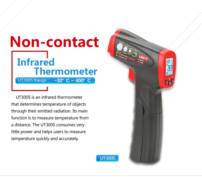 Обратите внимание, пожалуйстаТовар предназначен для промышленности, приготовления пищи, повседневной жизни. Нельзя использовать для человека.UNI-T UT300S Инфракрасный цифровой термометр промышленный бесконтактный термометр Цифровой Пистолет устройство измерения температурыОсобенности1. Двойной дисплей (в режиме реального времени/макс., в режиме реального времени/мин)2. Градусы Цельсия/градусы Фаренгейта3. ЖК-подсветка4. Автоматическое отключение питания5. Индикация низкого заряда батареи6. Автоматическое хранение данных7. Опционально (вкл/выкл) лазерная указка8. Регулируемый предел высокой/низкой температуры со звуковым сигналом