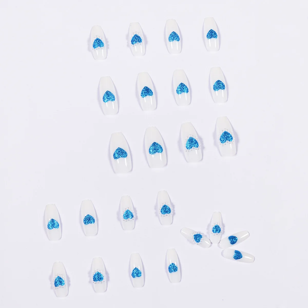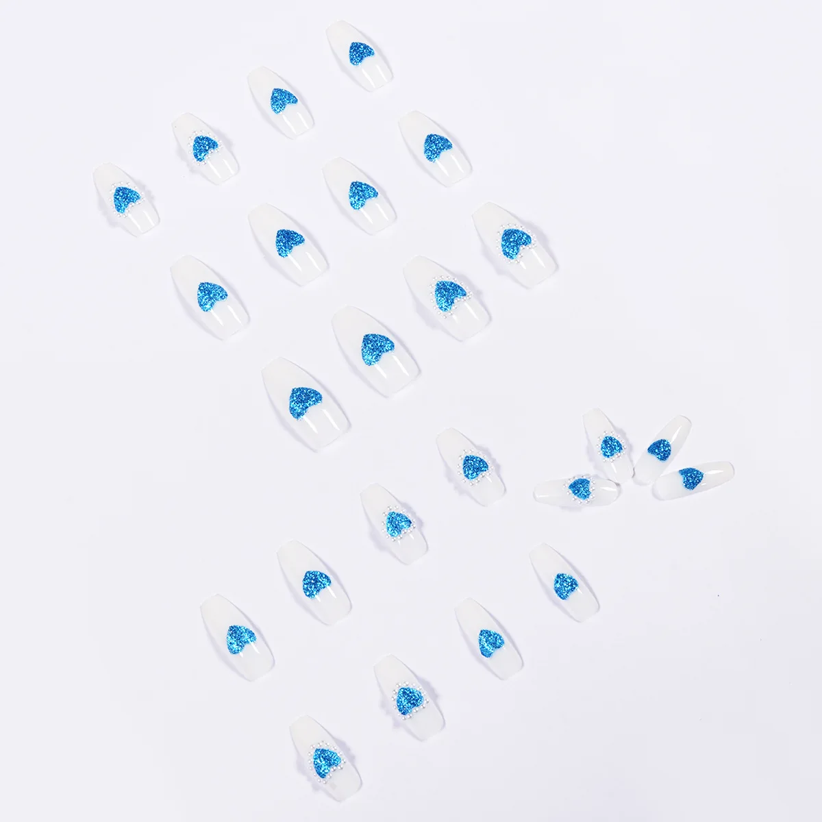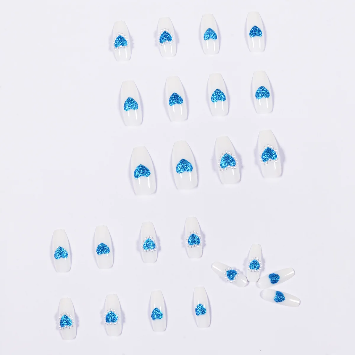 Искусственные ногти 24 шт. с клеем, Длинные блестящие синие сердца, полные жемчужные наклейки для ногтей, наклейки для девушек DL