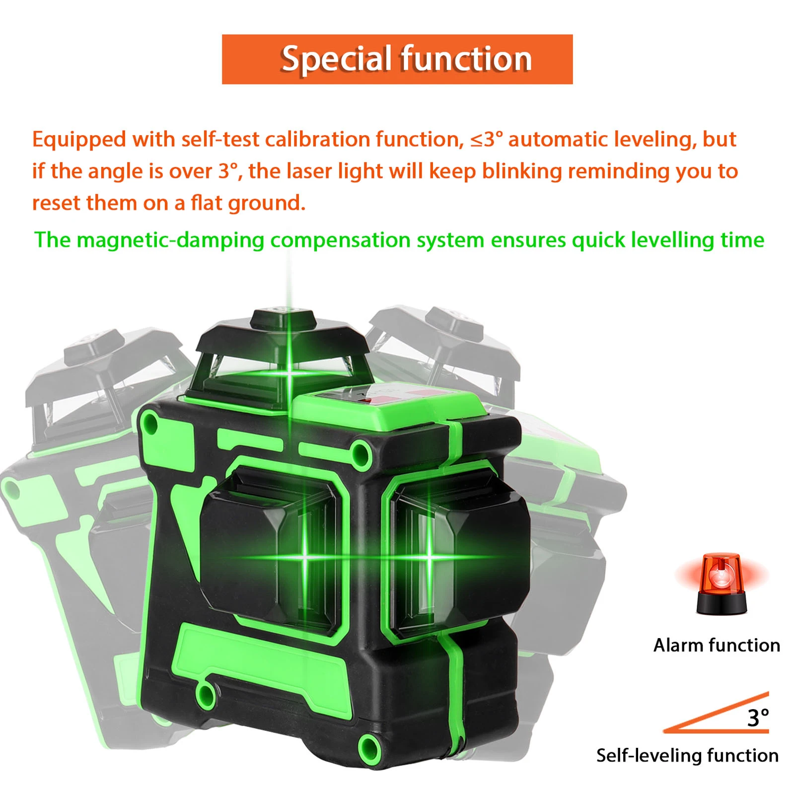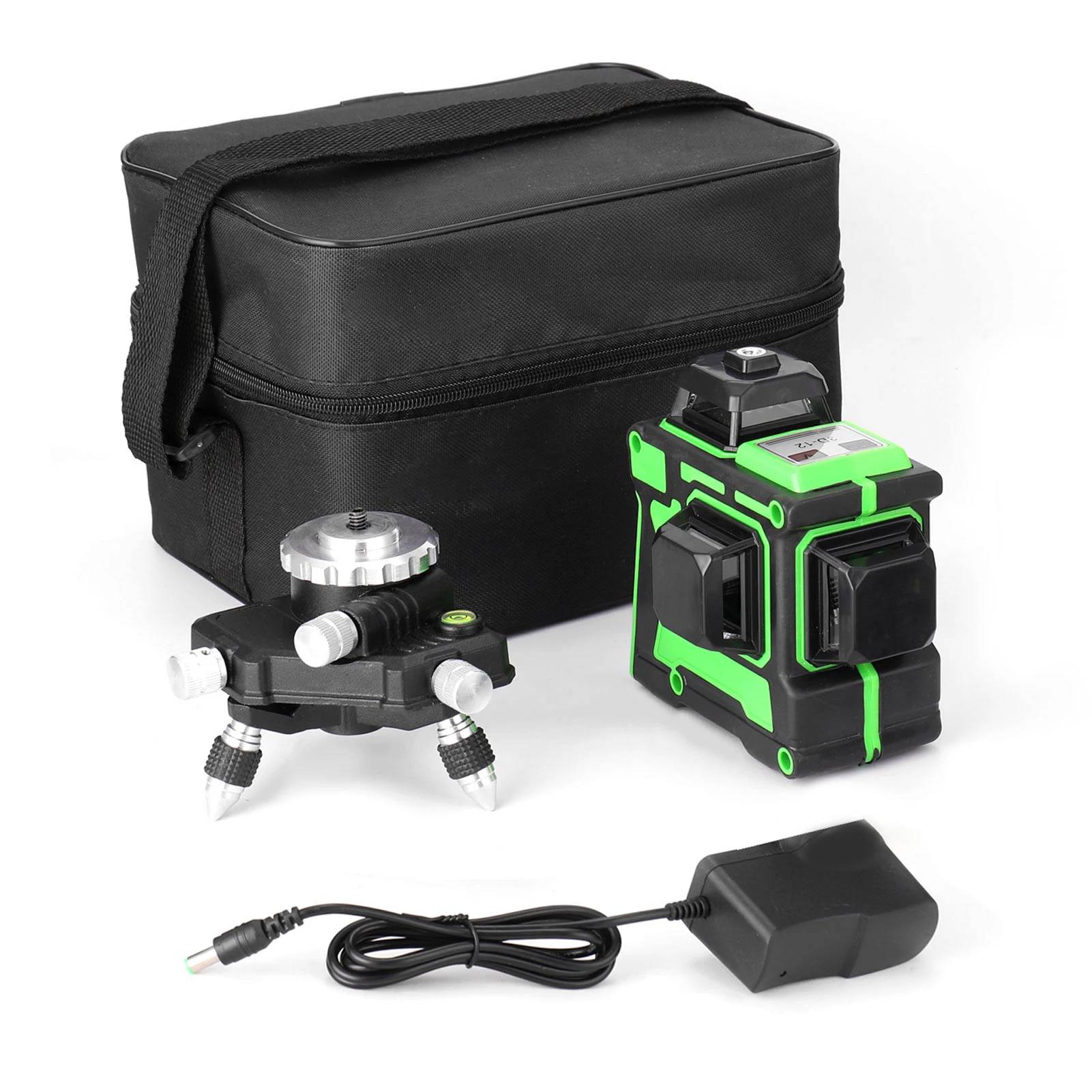 Многофункциональный лазерный 3D уровень, 12 линий, зеленый лазер, самонивелирующийся, 360 градусов, горизонтальные, вертикальные, перекрестные линии, беспроводной, с дистанционным управлением