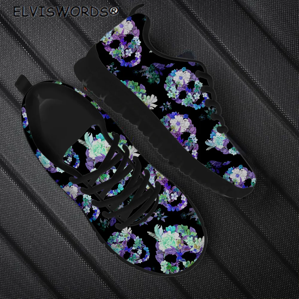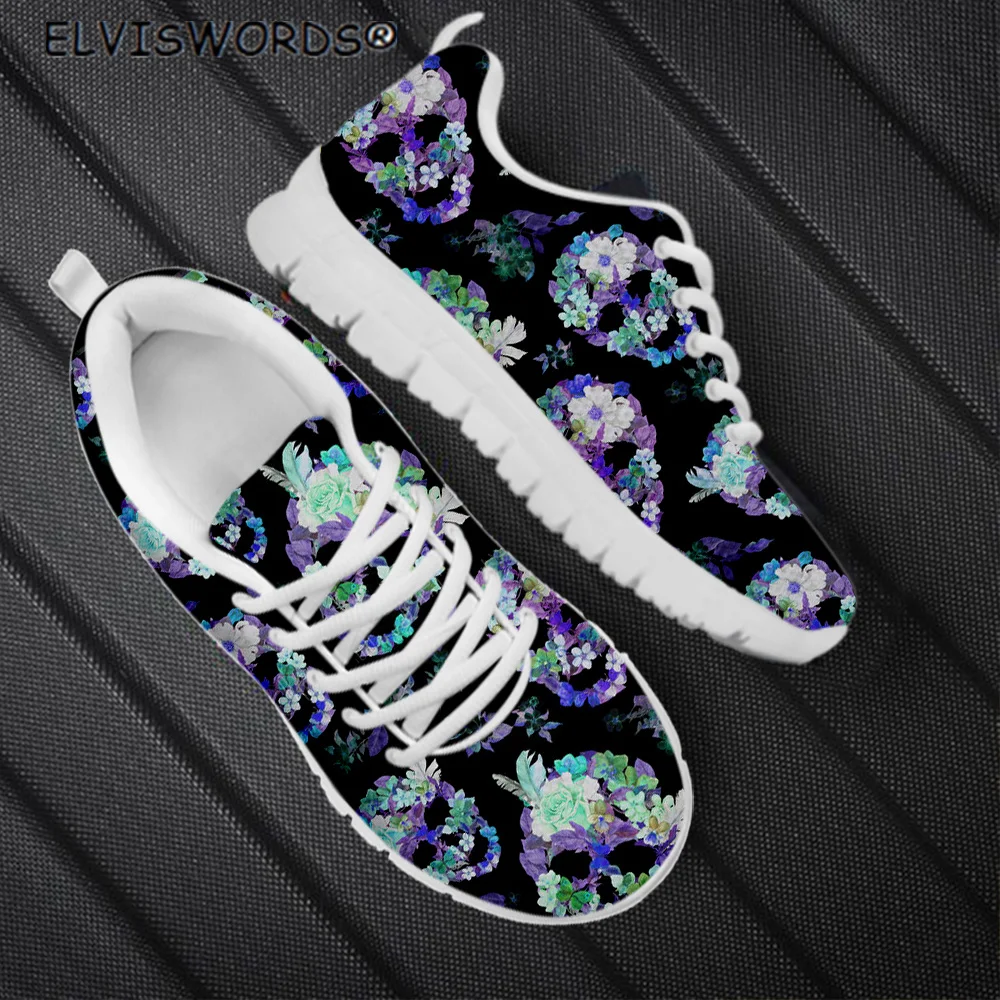 Кроссовки ELVISWORDS женские с сетчатым верхом, удобные сникерсы в цветочном стиле, на шнуровке, с изображением сахарного черепа, прогулочная обувь на плоской подошве