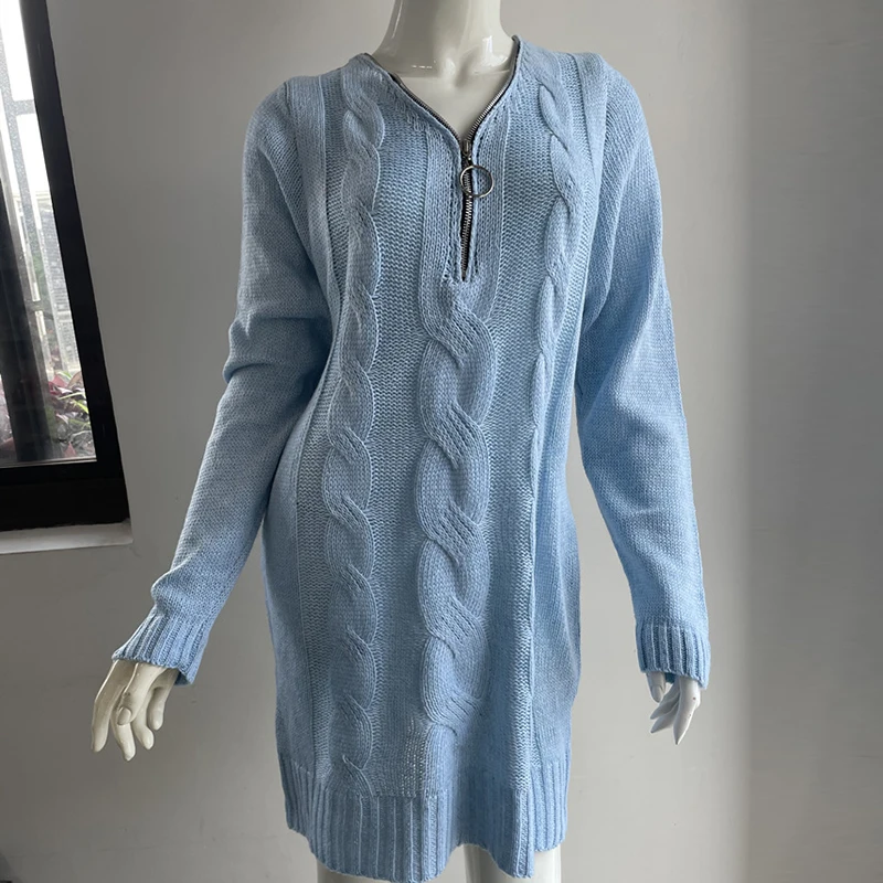 Женское трикотажное платье-свитер на молнии, с V-образным вырезом