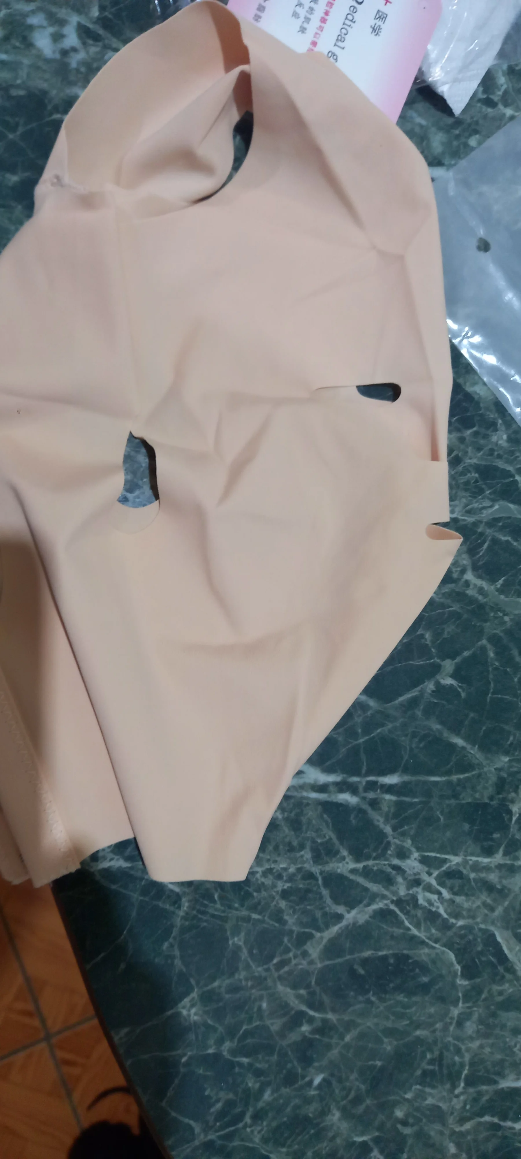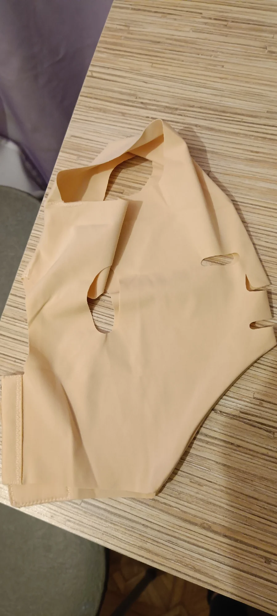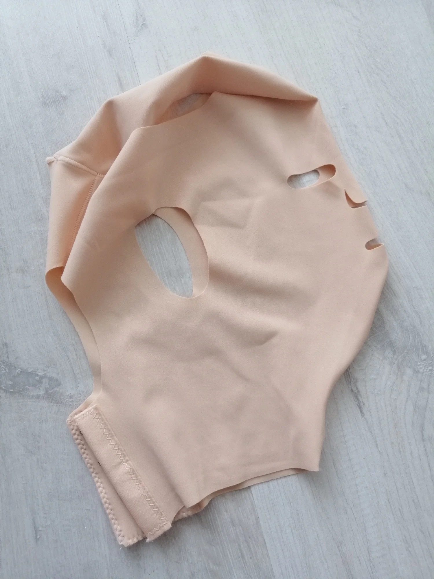 Доставка довольно быстрая, пришло недели за 2 до Красноярска, хотя обещали позже намного. Ткань тянется, но на очень круглое лицо, как мне кажется, может и не налезть. Тонкая, крючки на первую застегнула, и шею передавливает немного. А так на лицо налезла, вроде утягивает, села нормально где все дырки под глаза, уши, нос и рот( только губы немного сжимаются, зрелище ещё то) Вобщем будем пробовать, как это работает...