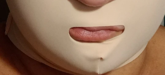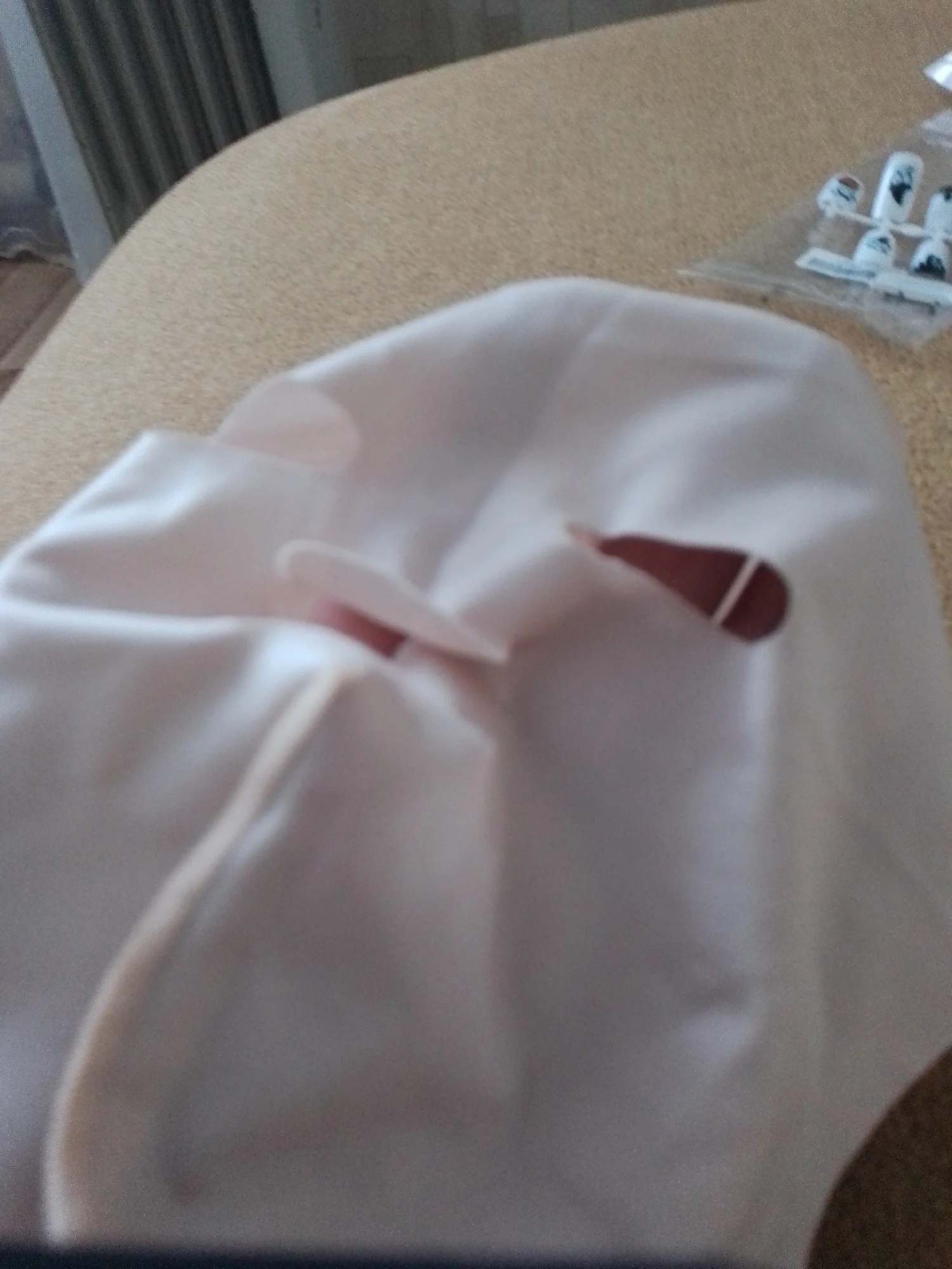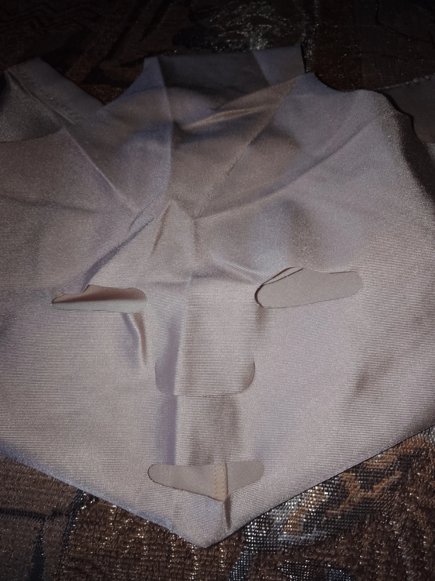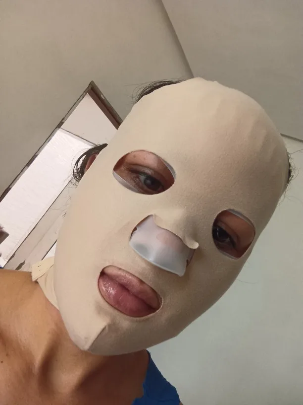 Доставка довольно быстрая, пришло недели за 2 до Красноярска, хотя обещали позже намного. Ткань тянется, но на очень круглое лицо, как мне кажется, может и не налезть. Тонкая, крючки на первую застегнула, и шею передавливает немного. А так на лицо налезла, вроде утягивает, села нормально где все дырки под глаза, уши, нос и рот( только губы немного сжимаются, зрелище ещё то) Вобщем будем пробовать, как это работает...