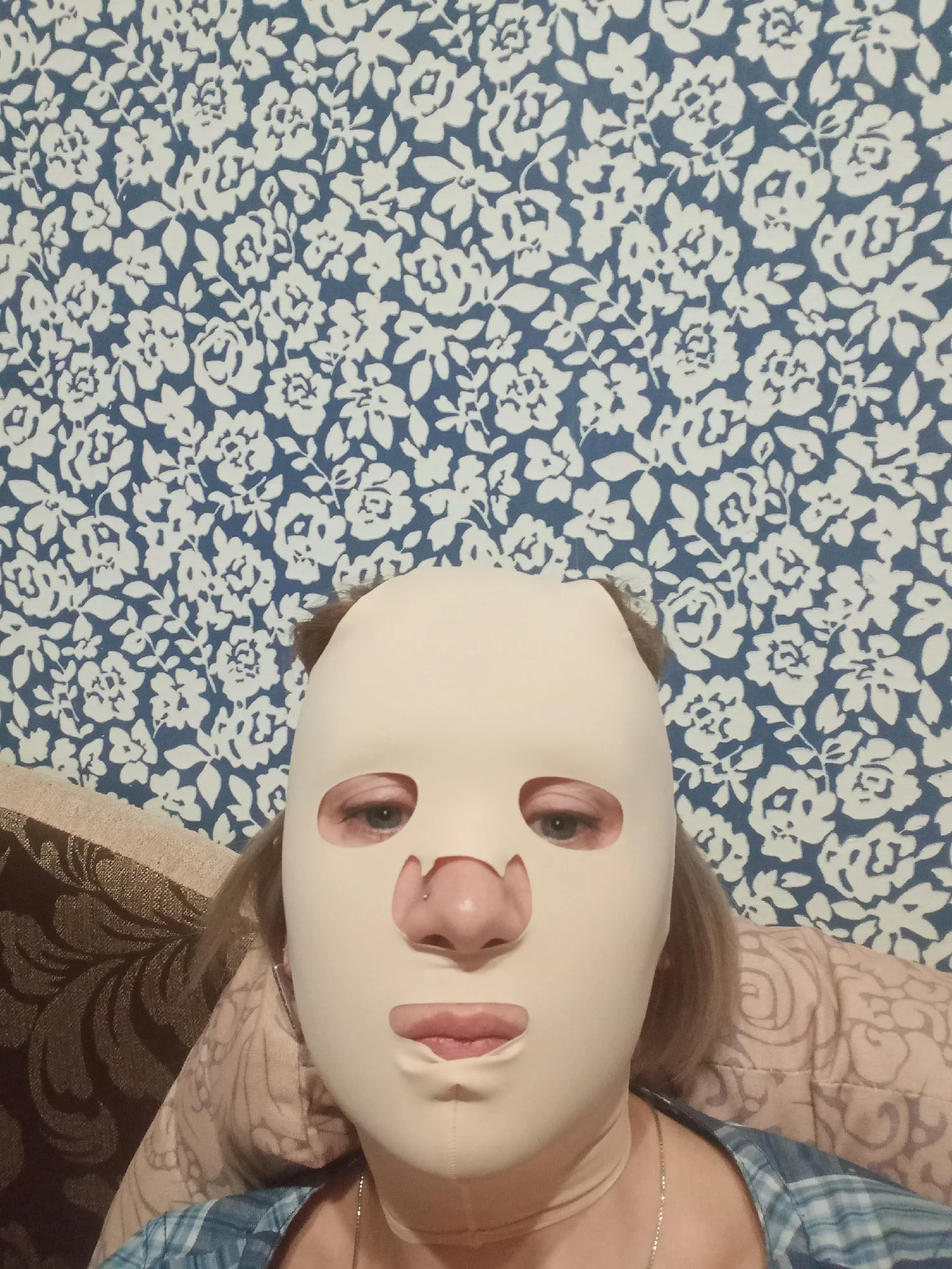 В прицепе товар понравился...Несколько непривычно...Коты перепугались... Походила полчасика днём...Удивилась насколько гладкое лицо. Наверное увеличу прорезь для губ. Попробую надеть на ночь... потом оставлю дополнительный отзыв. Думаю, можно скомбинировать маску с большими селиконовыми патчами (маленькие, наверное, собьются)... Спасибо, буду эксперементировать и приспосабливаться...
