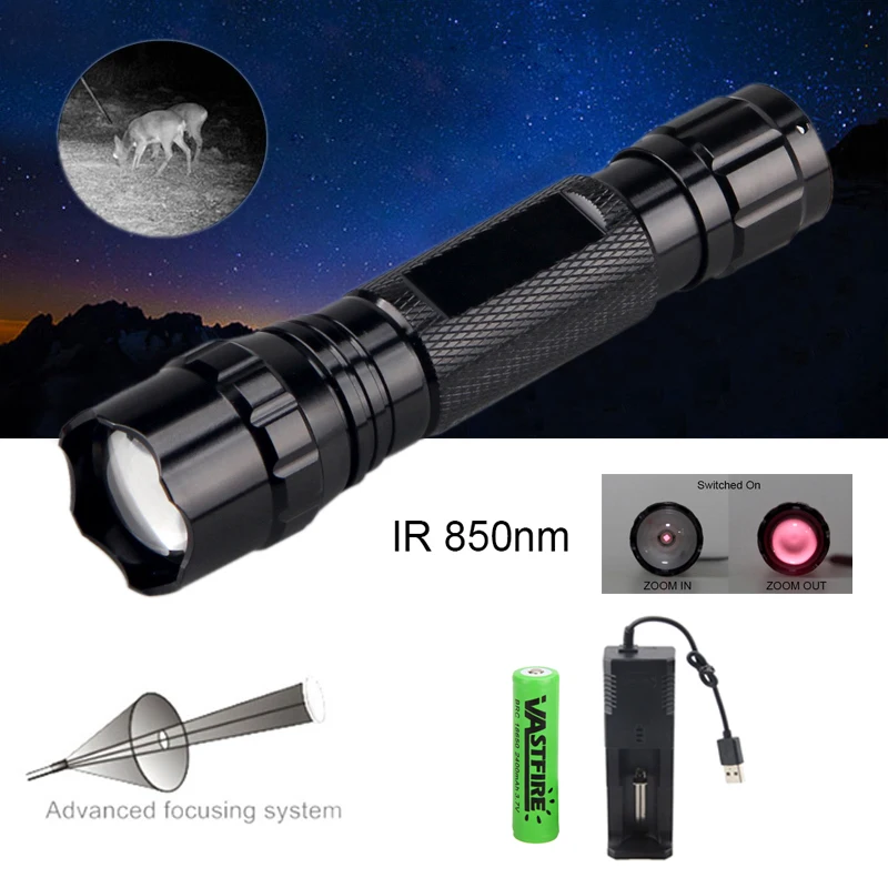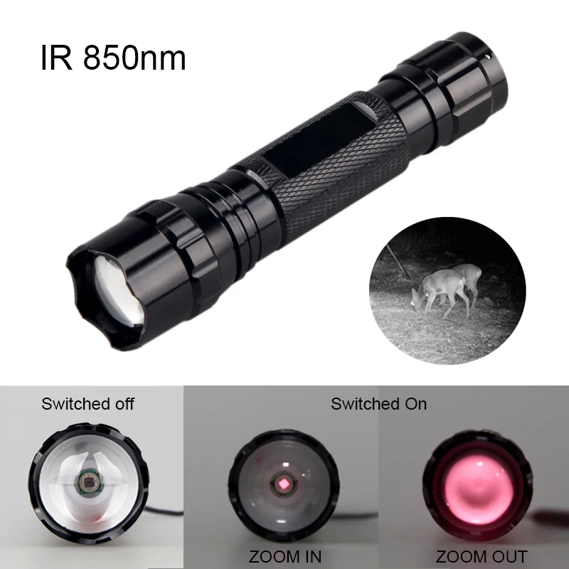 850нм светодиодный фонарик ОписаниеМасштабируемый фокус 850 нм светодиодный инфракрасный Излучение ИК лампа ночного видения фонарик фонарь:-Невидимый ИК-светильник: излучает инфракрасный светильник 850 нмДлина волны, подходит для использования с ночным видением, NVS, NVG DIY, камеры телефонов, Монокуляр, очки и камера, которые не блокируют инфракрасный светильник