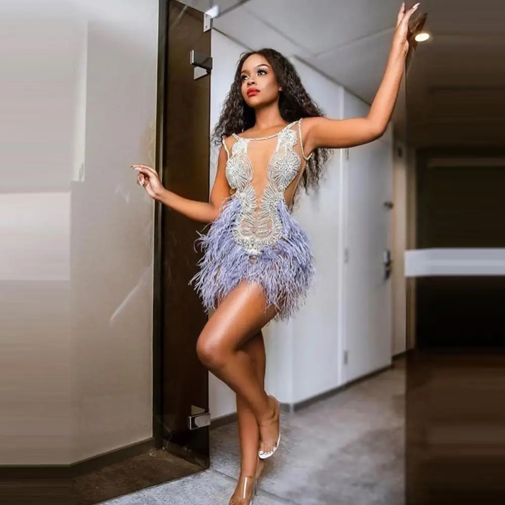 Прозрачное фиолетовое платье без рукавов с аппликацией бахромы и круглым вырезом