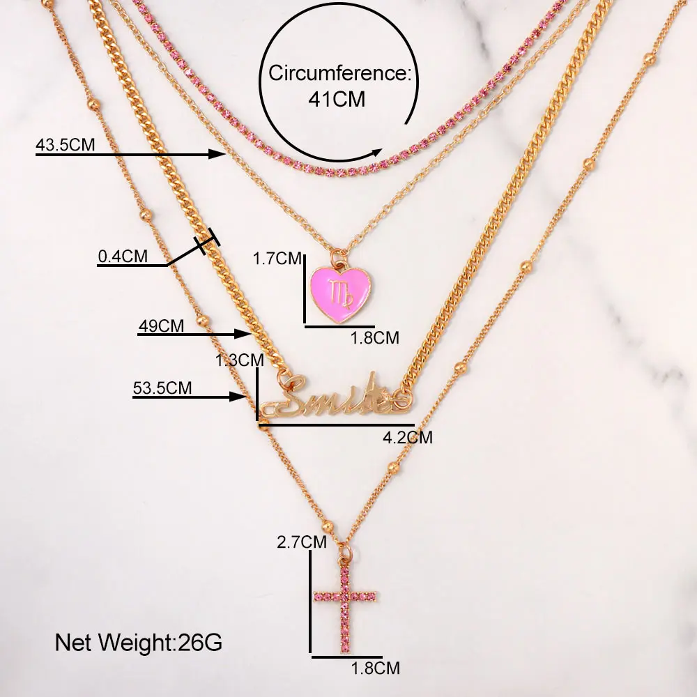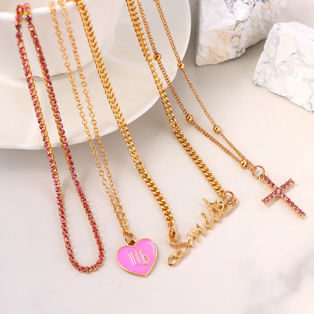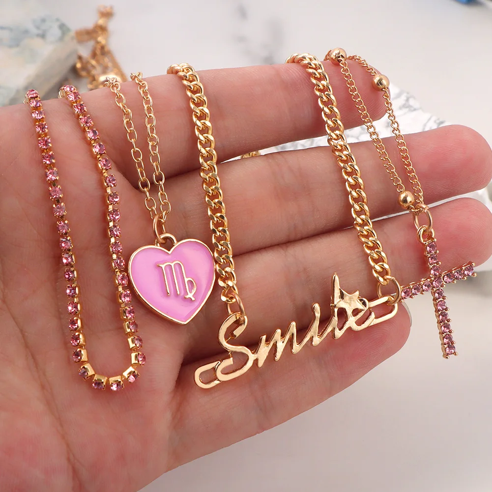 Женское многослойное ожерелье Flatfoosie, многослойное ожерелье с подвеской в виде сердца, розового цвета, с кристаллами, с буквами, 2021