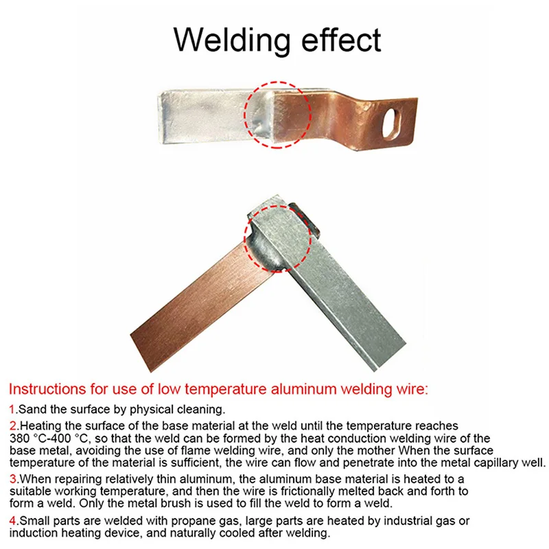 Использование:1. Очистите и отполируйте физическую поверхность.2. Нагревайте поверхность металлического материала до тех пор, пока температура провода не достигнет рабочей температуры 380 ℃ до 400 ℃.3. Алюминиевый базовый Металл нагревается до соответствующей рабочей температуры при ремонте тонкого алюминия, а затем используется трение проволоки и форма сварного шва.4. Используйте пропановый газ для сварки небольшого объекта и Используйте промышленный газ или устройство индукционного нагрева для нагрева и сварки большого, вы должны охладить его естественным образом после сварки.Внимание:1. Чем толще изделие, тем труднее нагревать его, поэтому важно использовать разумный источник тепла.2. Если температура поверхности основного металла достигает рабочей температуры сварочной проволоки, вы можете начать сварку.3. При использовании оксиацетиленовой сварки следует использовать нейтральную пламенную сварку, но, пожалуйста, не сжигайте провод напрямую.4. Применимый источник тепла: пропан, оксиацетилен и так далее.5. Хранение: Храните в сухом и проветриваемом месте.Примечания:1. Пожалуйста, учитывайте разницу в 1-3 мм из-за ручного измерения, спасибо!2. Из-за разницы между различными мониторами, пожалуйста, поймите, что изображение может не отражать фактический цвет товара.