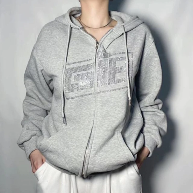 Новинка Стразы толстовки с капюшоном с буквенным принтом женские с длинным рукавом на молнии Свободные повседневные пальто оверсайз Y2K осенние толстовки наряды