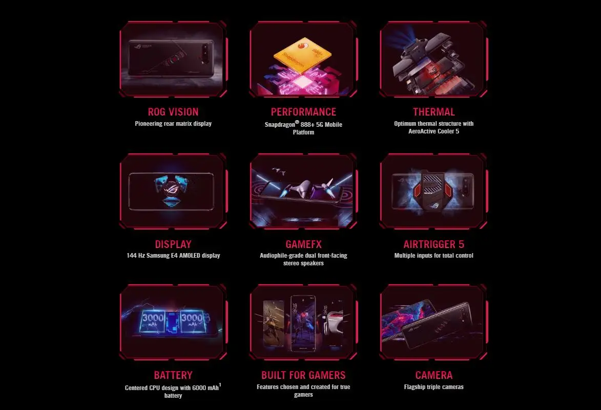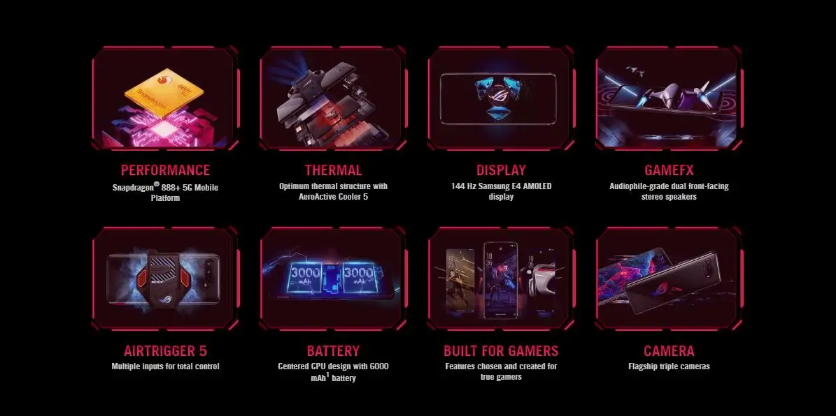 Подпитывается для победы последней Qualcomm®Snapdragon®888 + 5G Мобильная платформа, ROG Phone 5s запускает ваш мобильный игровой опыт в следующем измерении. Благодаря невероятно чувствительной частоте сенсорного дискретизации 360 Гц дисплей 144 Гц/1 мс обеспечивает вам самый Гладкий опыт просмотра. Он также упаковывает батарею monster 6000 mAh1, управление AirTrigger 5 и нашу известную аудиосистему GameFX. Решитесь выбрать телефон ROG 5s, и вы будете награждены непревзойденной производительностью для ведущих в мире игр и развлечений.