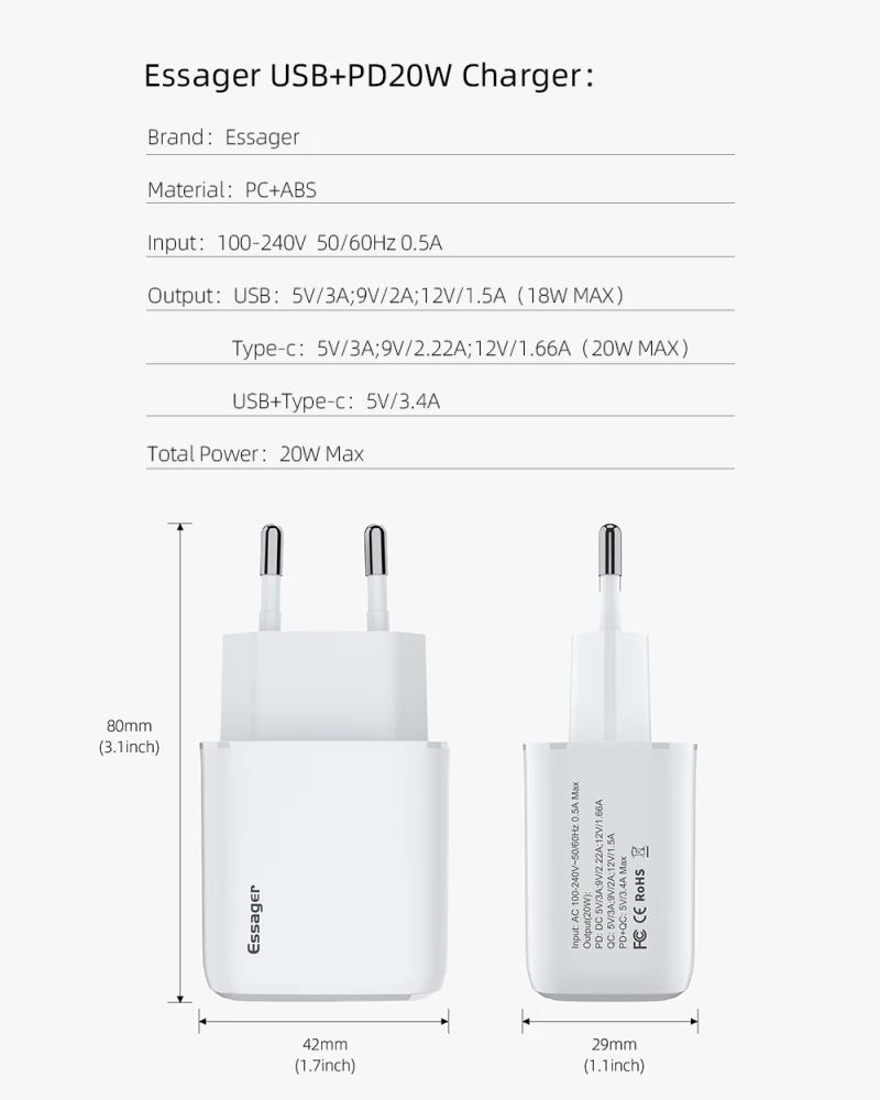 Type-c-5V/3A;9V/2.22A;12V/1.66A-20W MAX