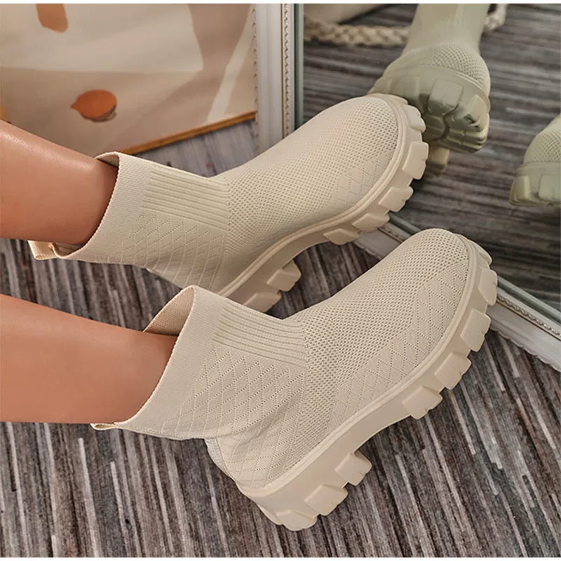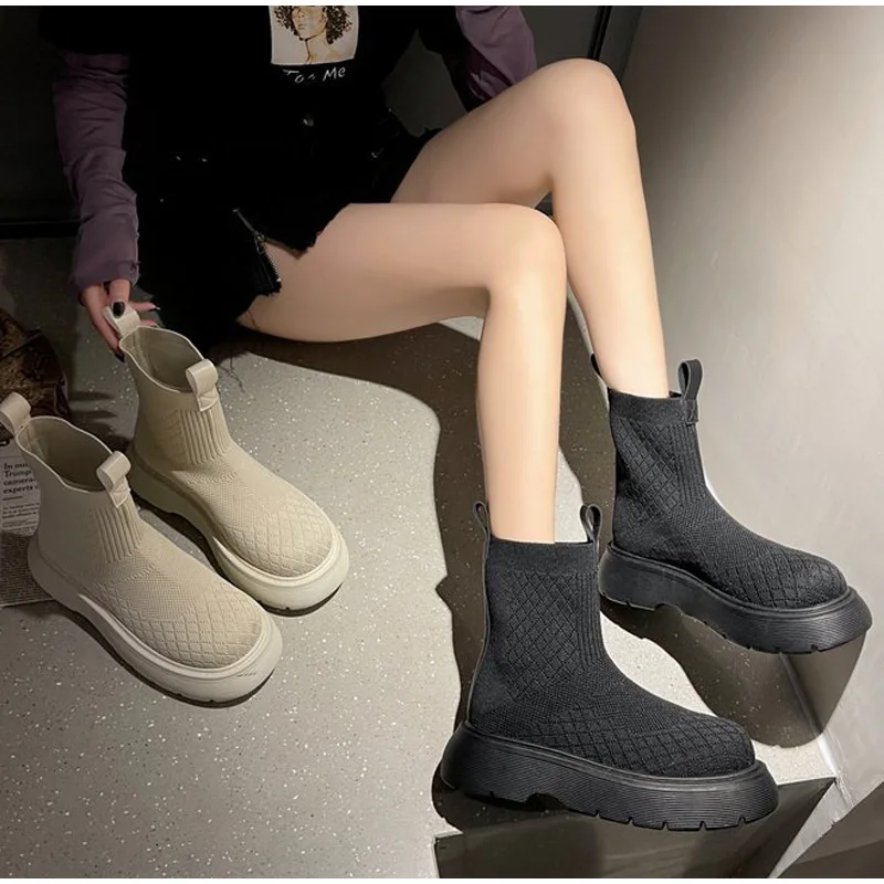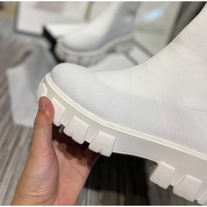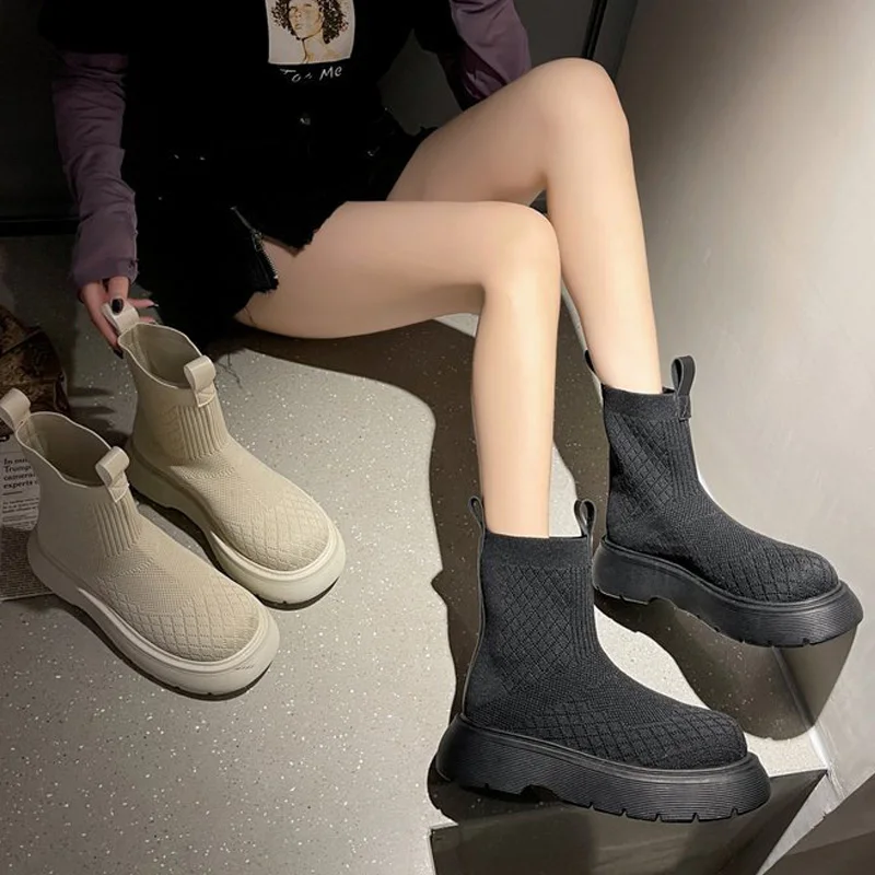 Женские вязаные ботинки, сетчатые однотонные ботильоны на платформе без шнуровки, удобные короткие ботинки на толстой подошве, женская повседневная обувь 2022